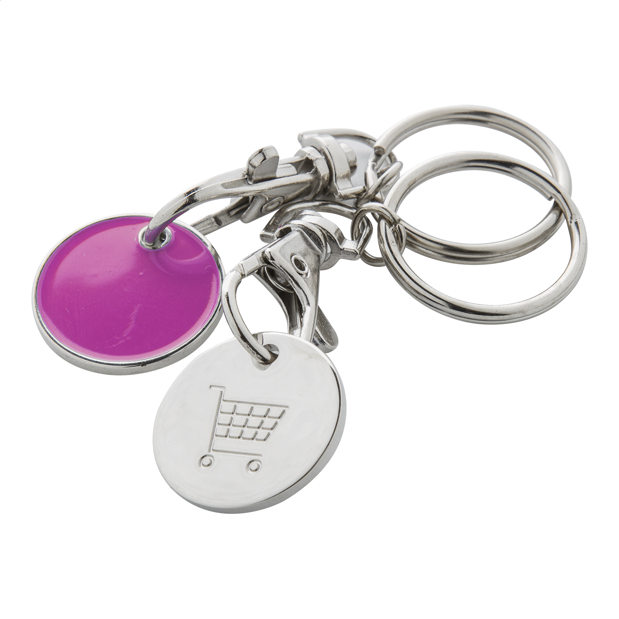 Portachiavi in metallo con gettone per carrello della spesa. Un lato del gettone è colorato mentre su l'altro è inciso un carrello della spesa. Dimensioni della moneta: ø23×1,7 mm.