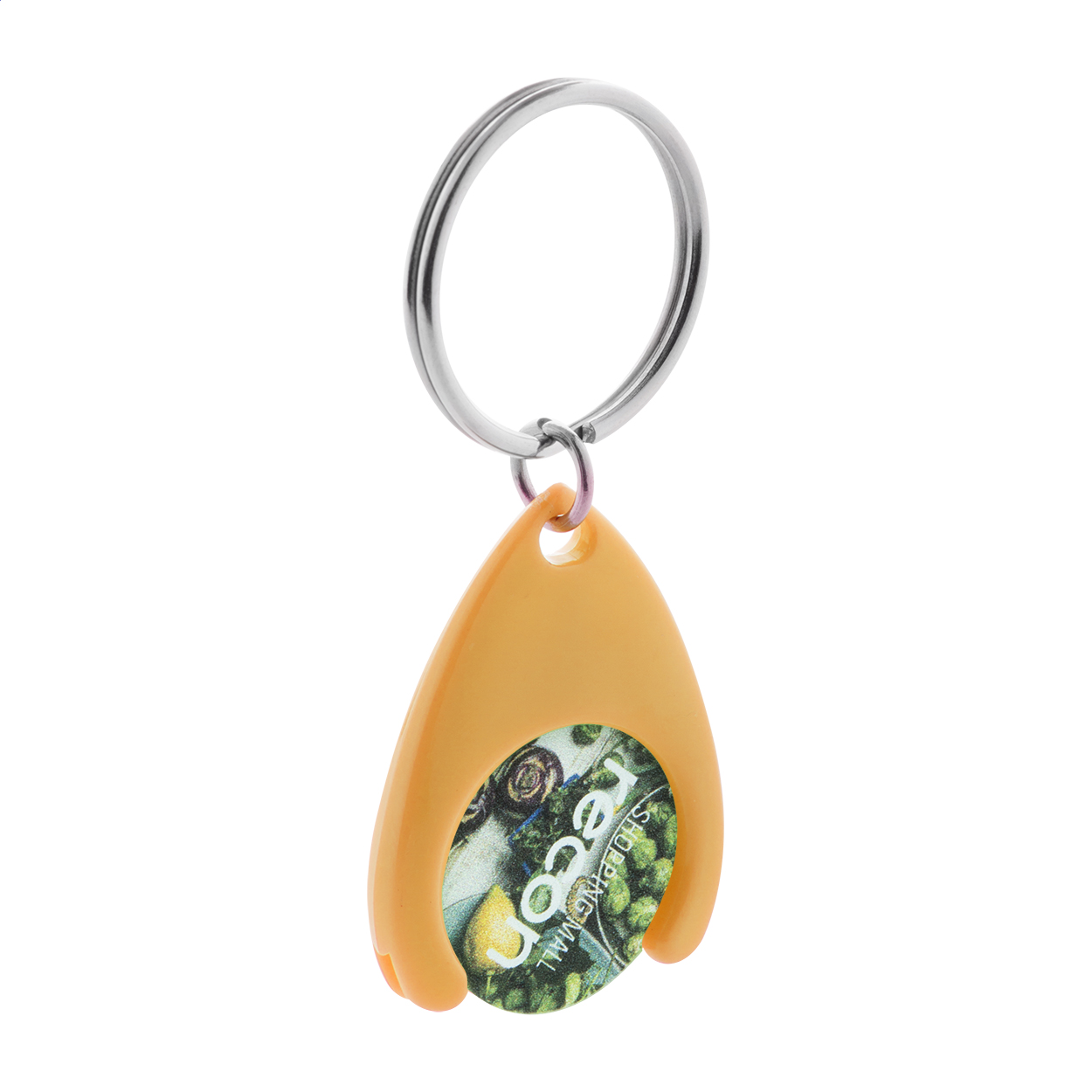 Portachiavi in plastica con anello in metallo e gettone per carrello. Dimensione gettone: ø24×2 mm.