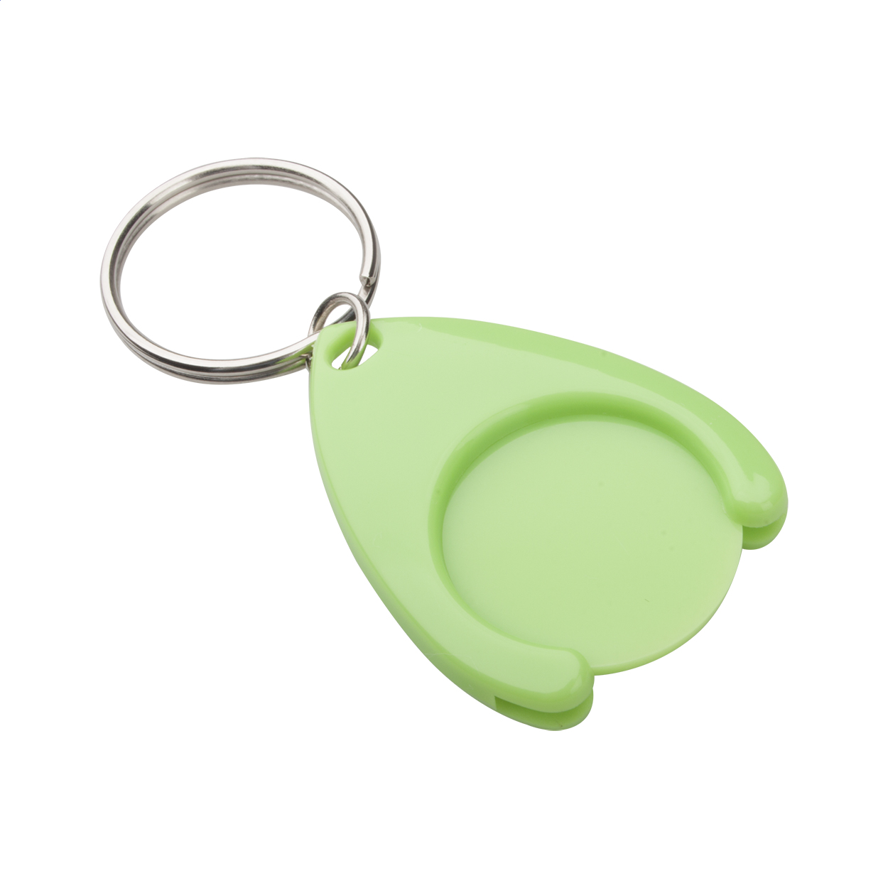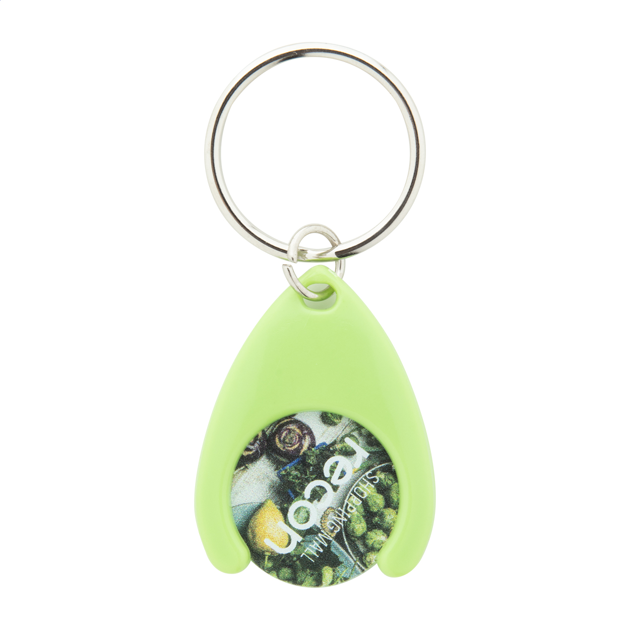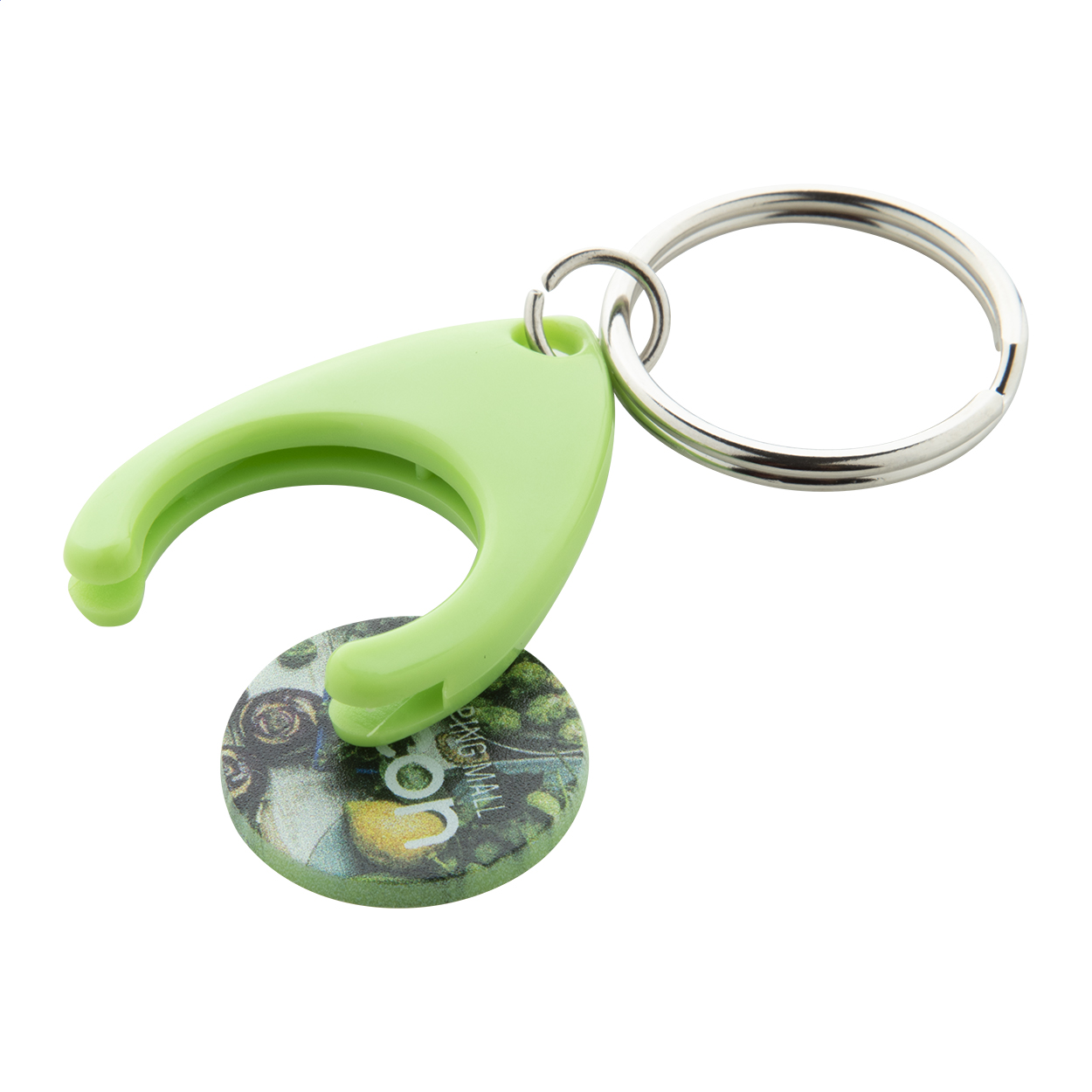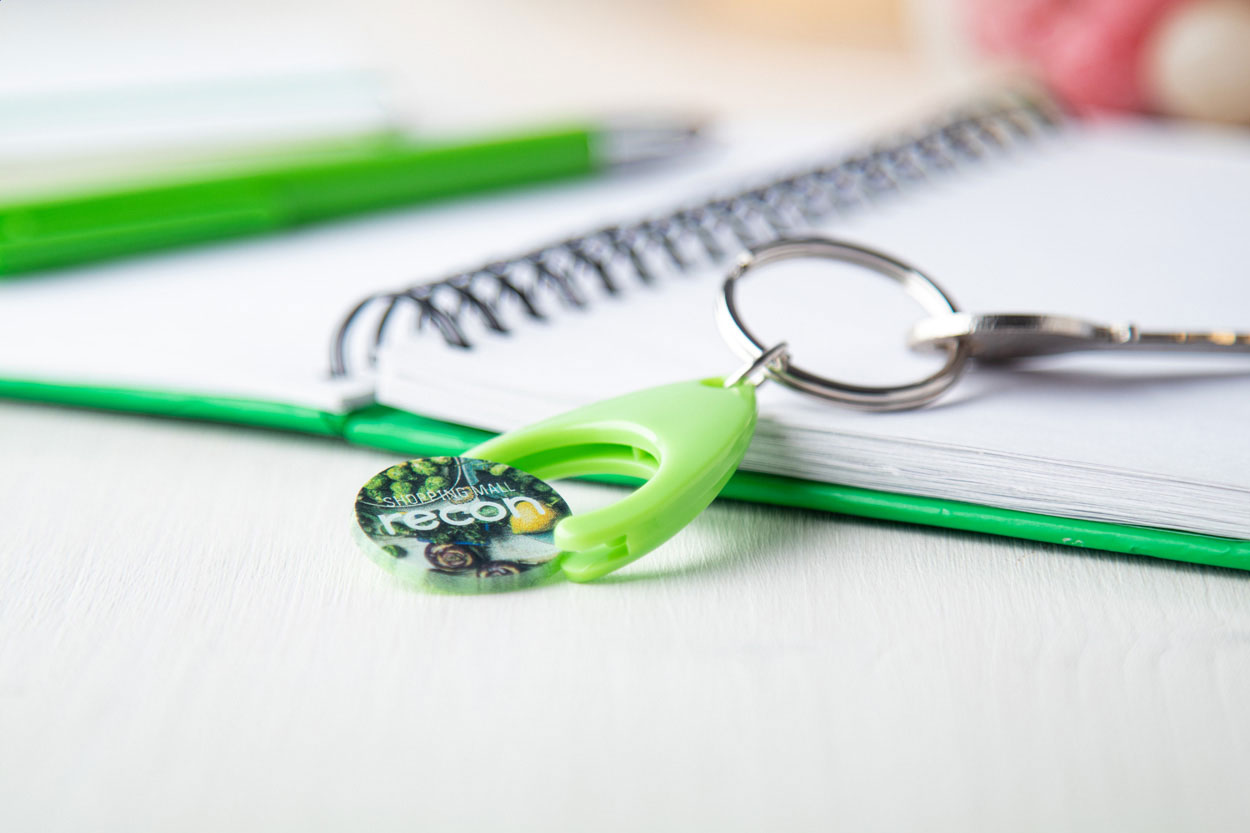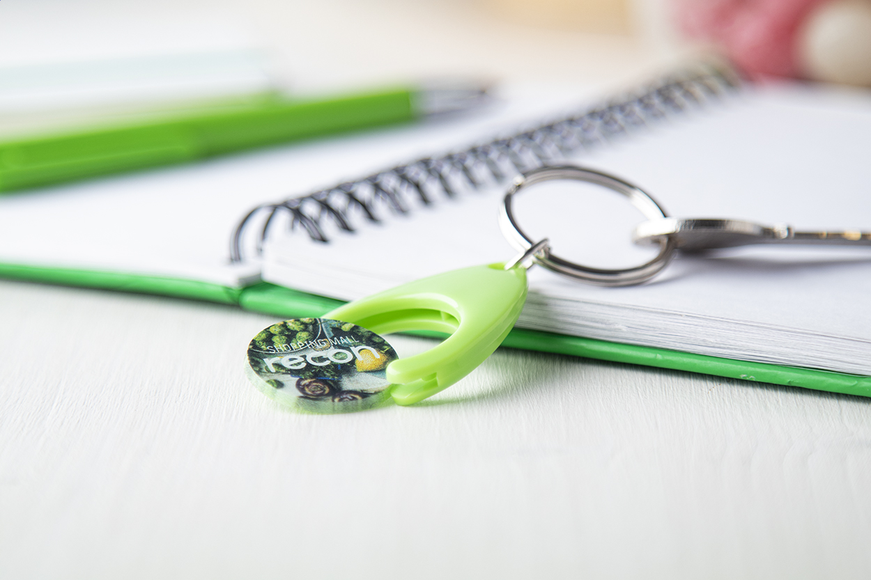 Portachiavi in plastica con anello in metallo e gettone per carrello. Dimensione gettone: ø24×2 mm.