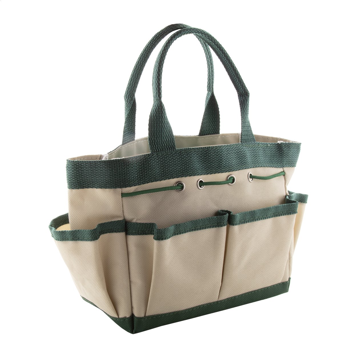 Set da giardino composto da sacca organizer in nylon, forbici per potare, rastrello, due palette, filo per legare con taglierina, spruzzatore ed un paio di guanti.