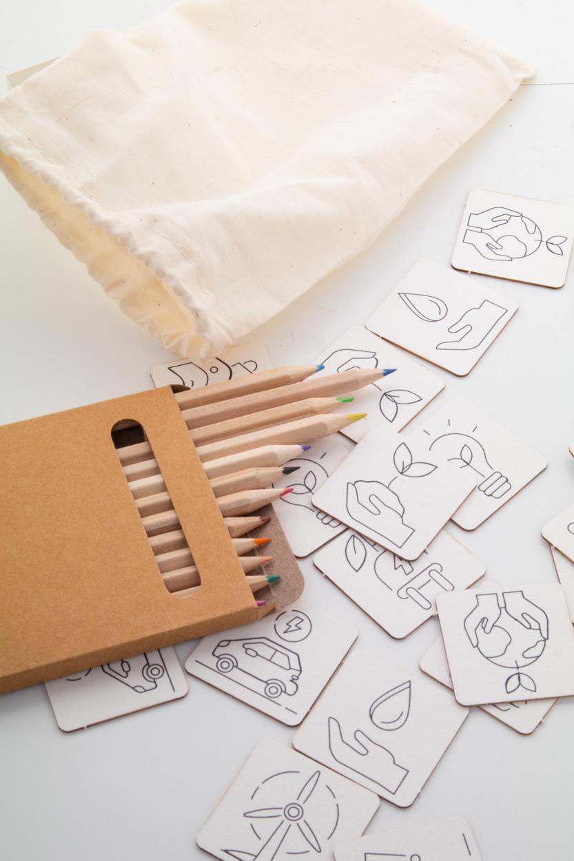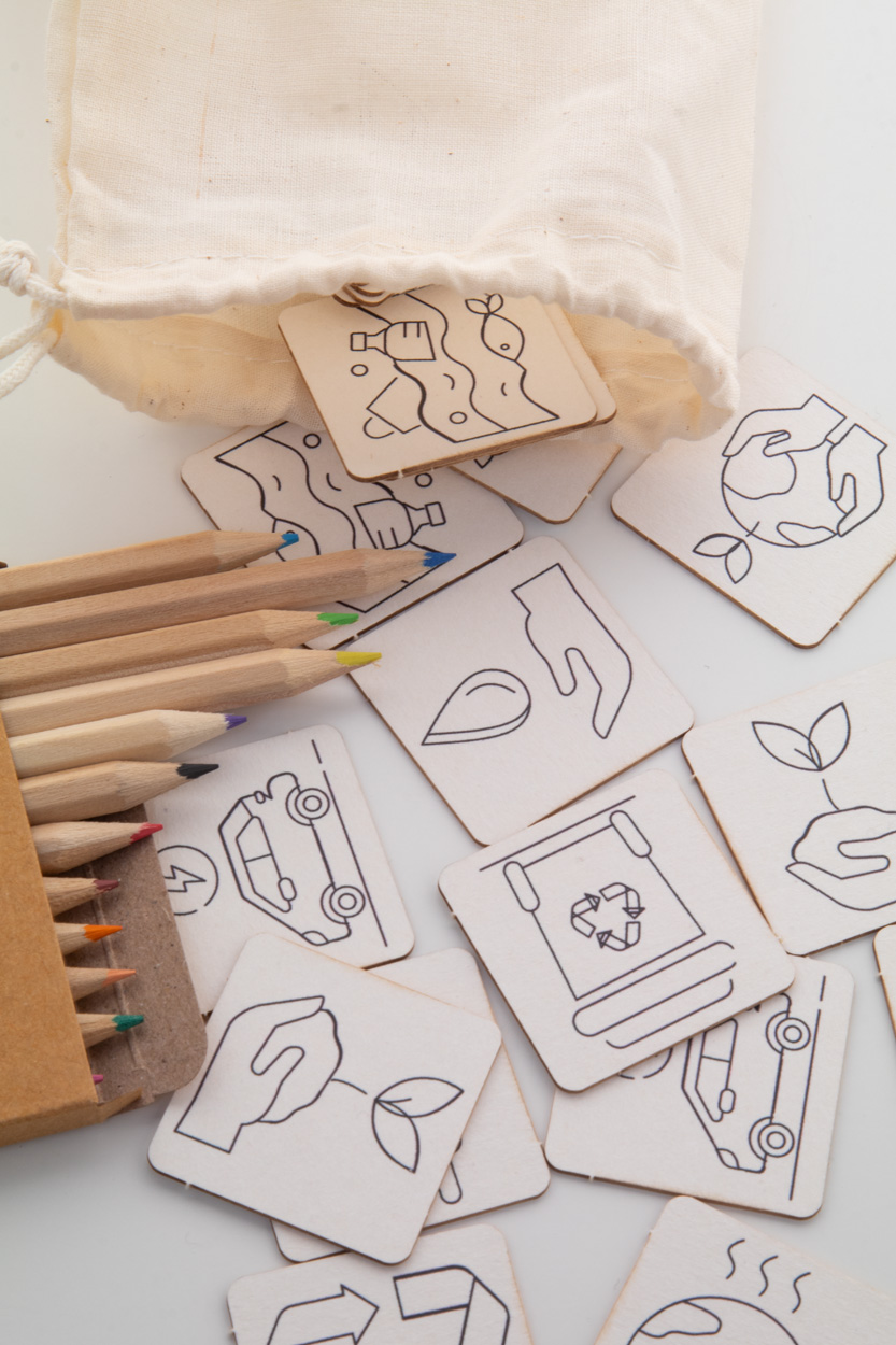 Gioco di memoria da colorare in una sacca di cotone ideale anche per il viaggio. Include un gioco di memoria tematico in cartoncino (24 tessere) e matite colorate in legno (12 pezzi) contenute in una scatola di cartoncino.