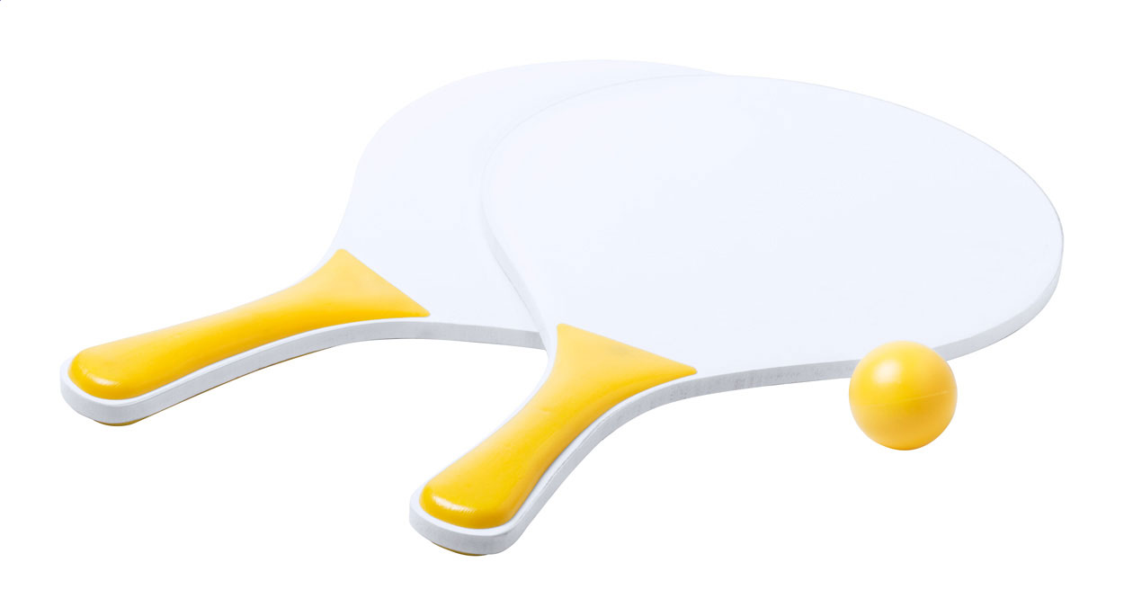 Beach tennis con 2 grandi racchette e una pallina, in legno e plastica.
