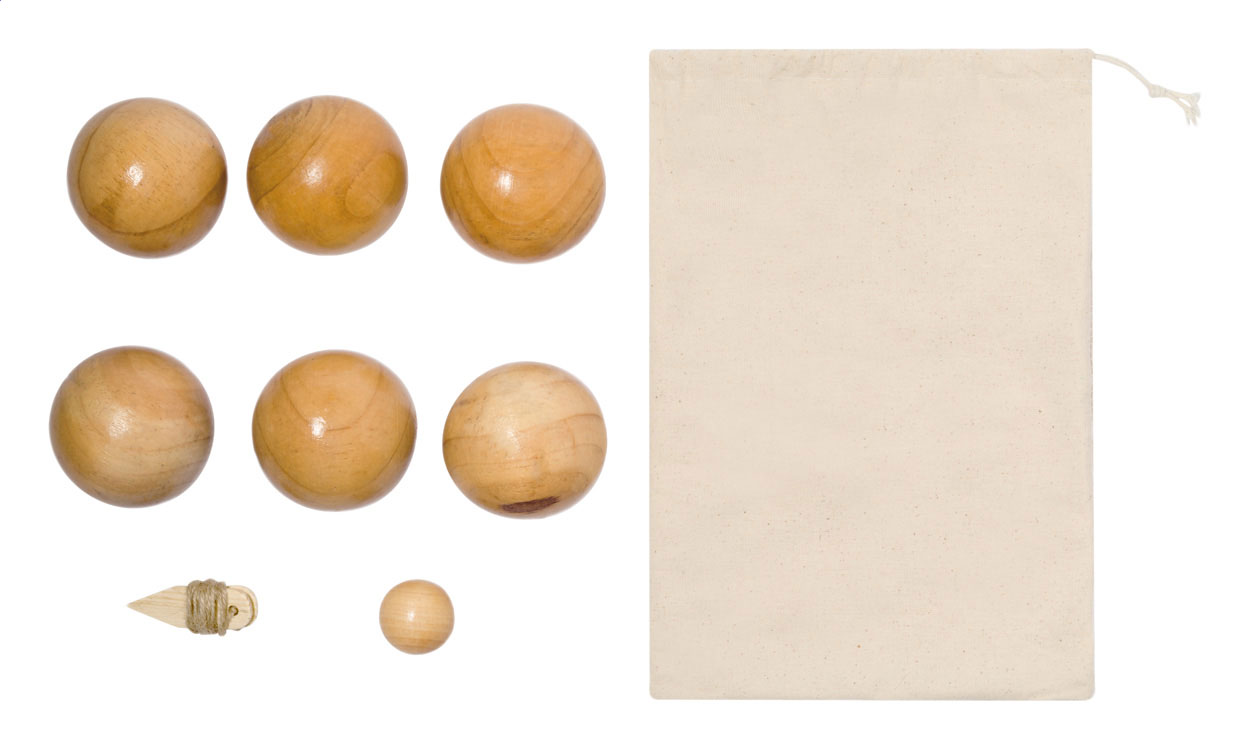 Set da gioco per bocce pétanque in legno con 6 palline e borsa in cotone con chiusura a coulisse.