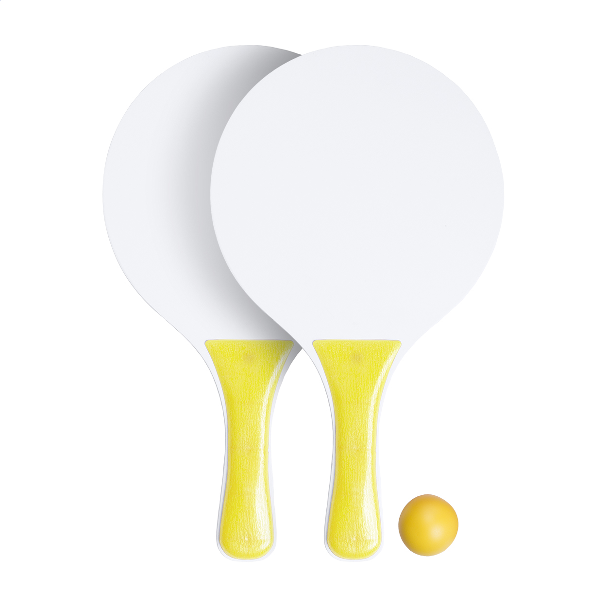 Set 2 racchettoni da spiaggia in legno e plastica con pallina.