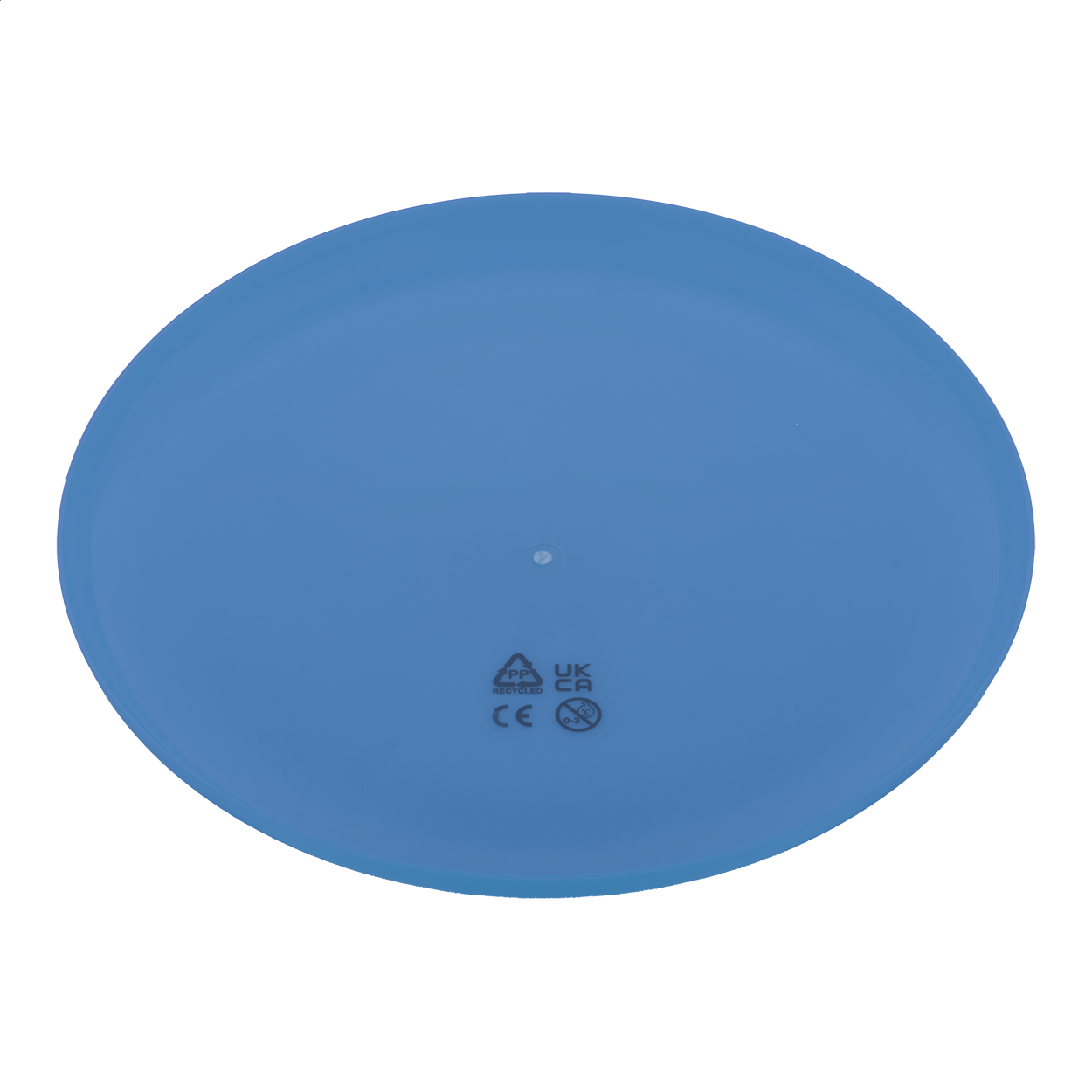 Frisbee in plastica PP riciclata con superficie piatta ideale per la stampa.