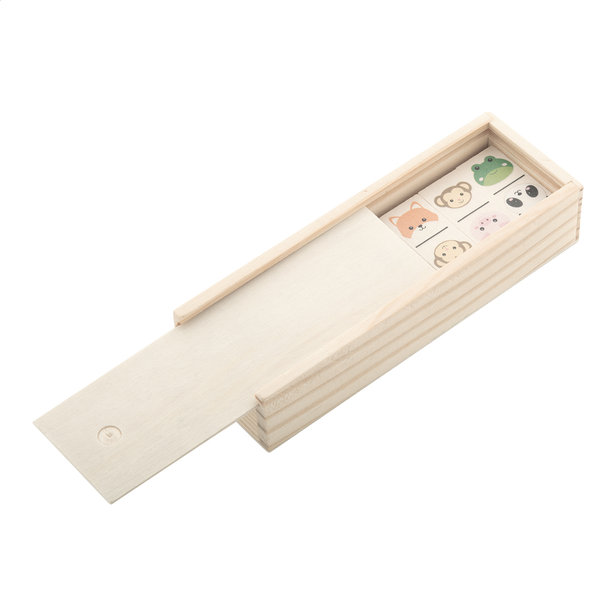 Gioco del domino con 28 tessere in legno con grafica tematica e scatola di legno.