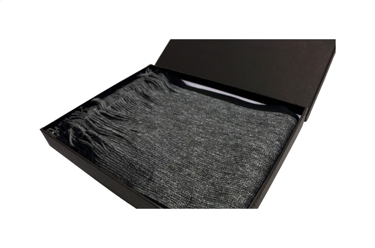 Elegante sciarpa in poliestere RPET in confezione regalo nera ed etichetta RPET.