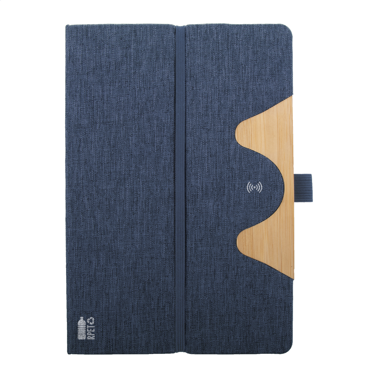 Quaderno formato A5, con 80 pagine a righe in carta riciclata, copertina in poliestere RPET ed inserto in bambù, portacellulare, caricatore rapido wireless integrato (15W) e cavo di ricarica USB.