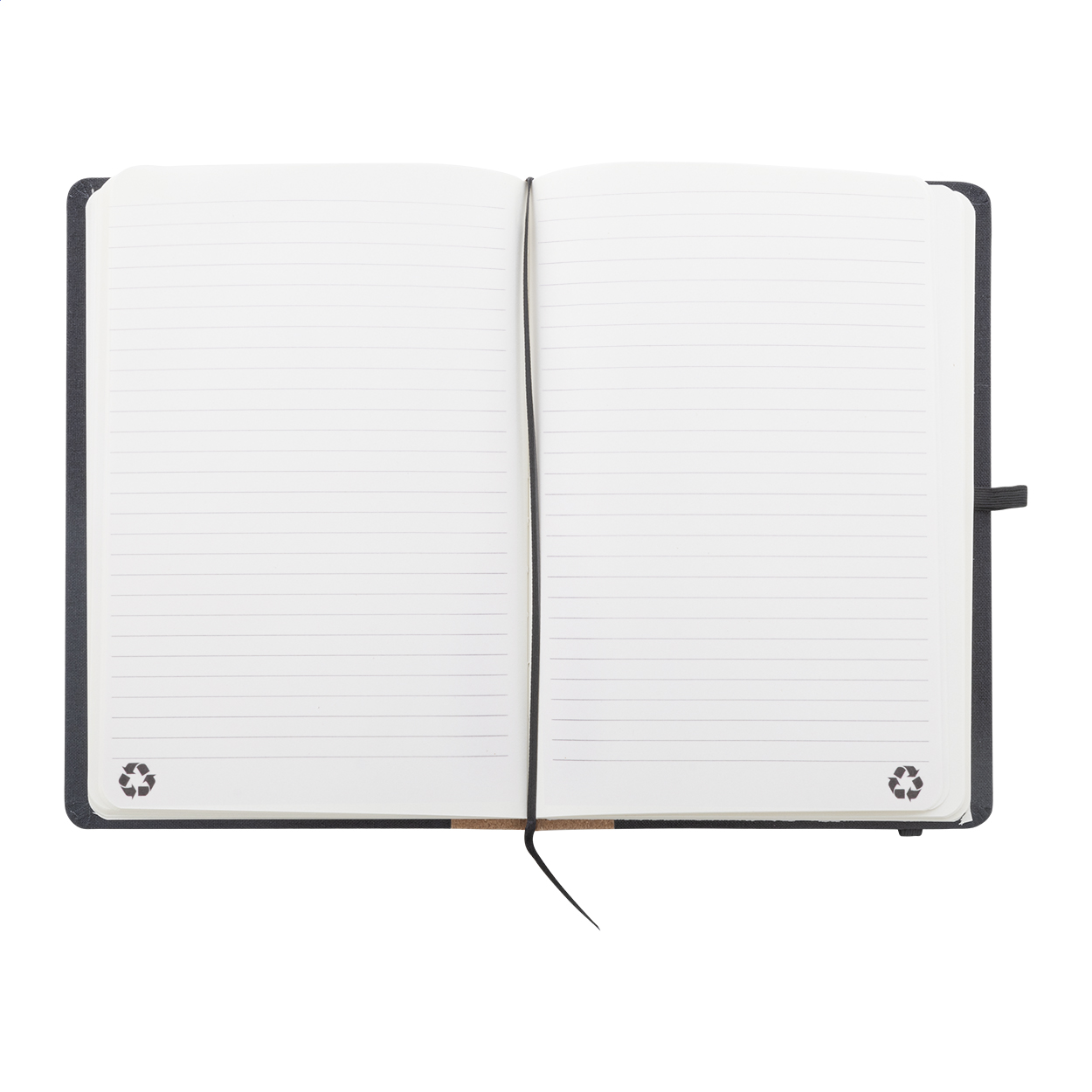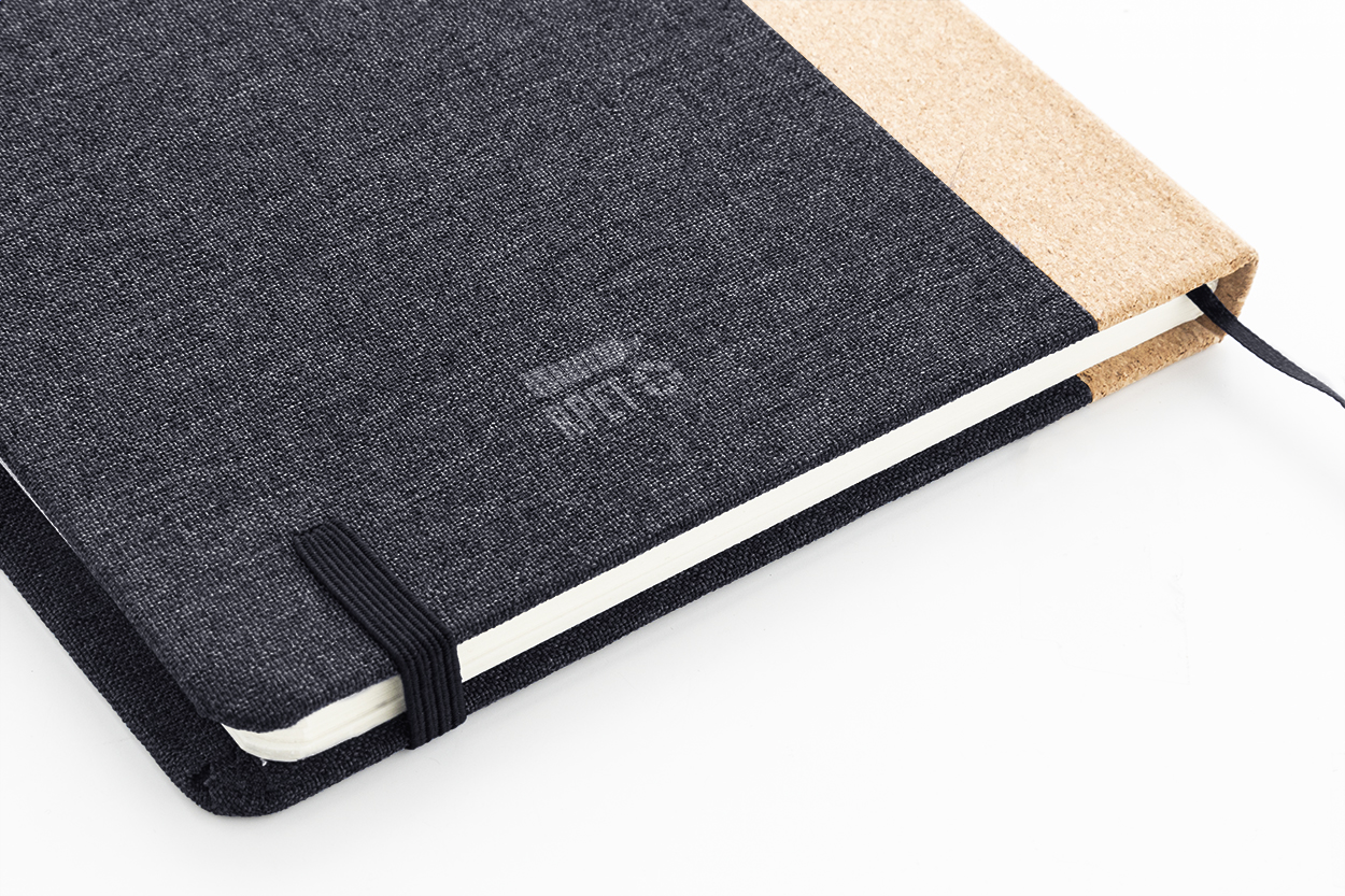 Quaderno formato A5 con copertina in poliestere RPET, dorso in sughero naturale, 80 fogli a righe in carta riciclata, segnalibro, elastico in gomma e portapenne.