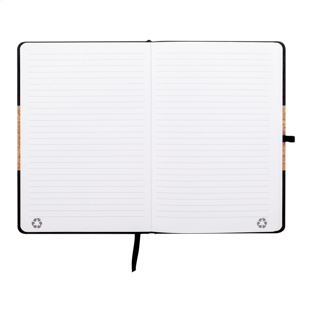 Quaderno formato A5 con copertina in sughero naturale e pelle PU riciclata, 80 fogli a righe in carta riciclata, segnalibro in colore coordinato, elastico e portapenne.