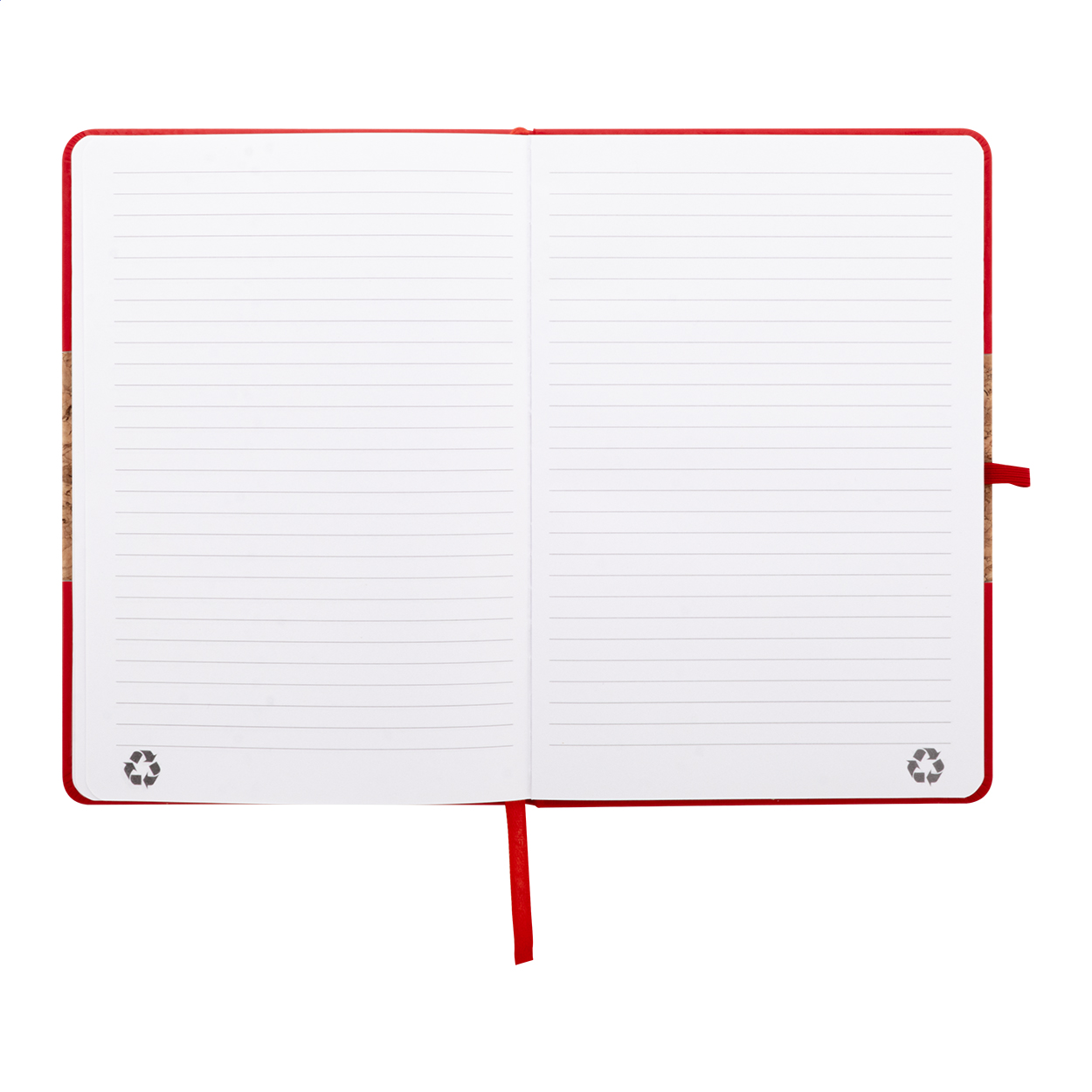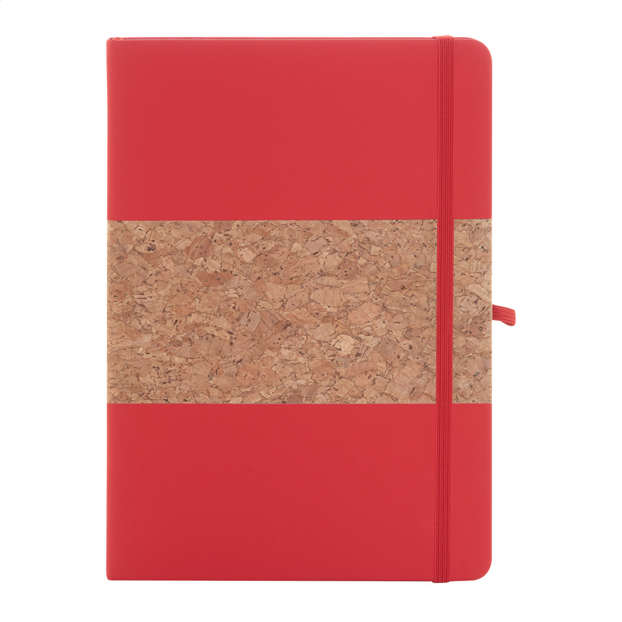 Quaderno formato A5 con copertina in sughero naturale e pelle PU riciclata, 80 fogli a righe in carta riciclata, segnalibro in colore coordinato, elastico e portapenne.