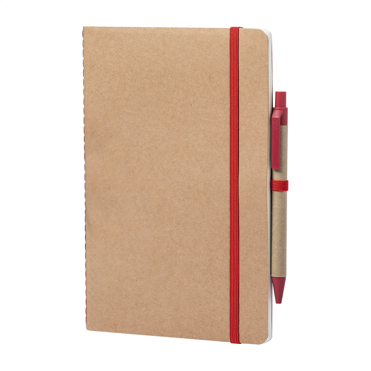 Quaderno ricoperto di cartone riciclato con 60 fogli bianchi e cinturino in gomma colorata, formato A5. Compresa una penna a sfera in plastica di paglia di grano con refill blu.