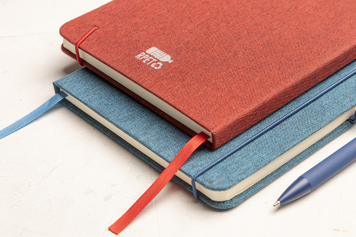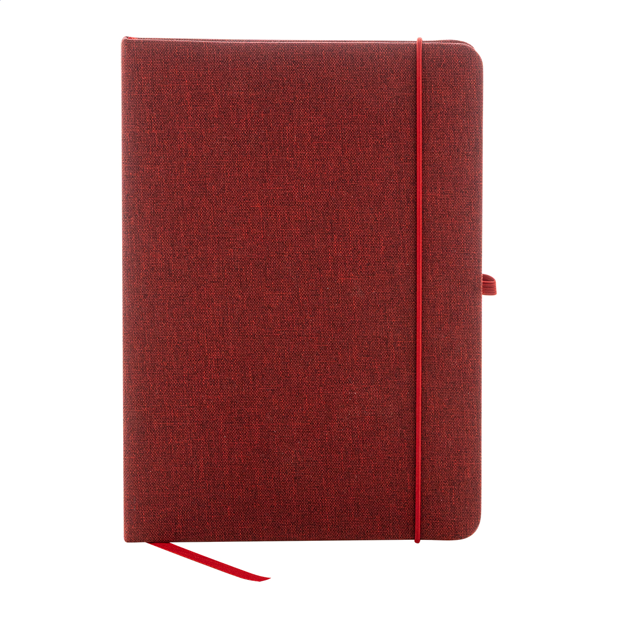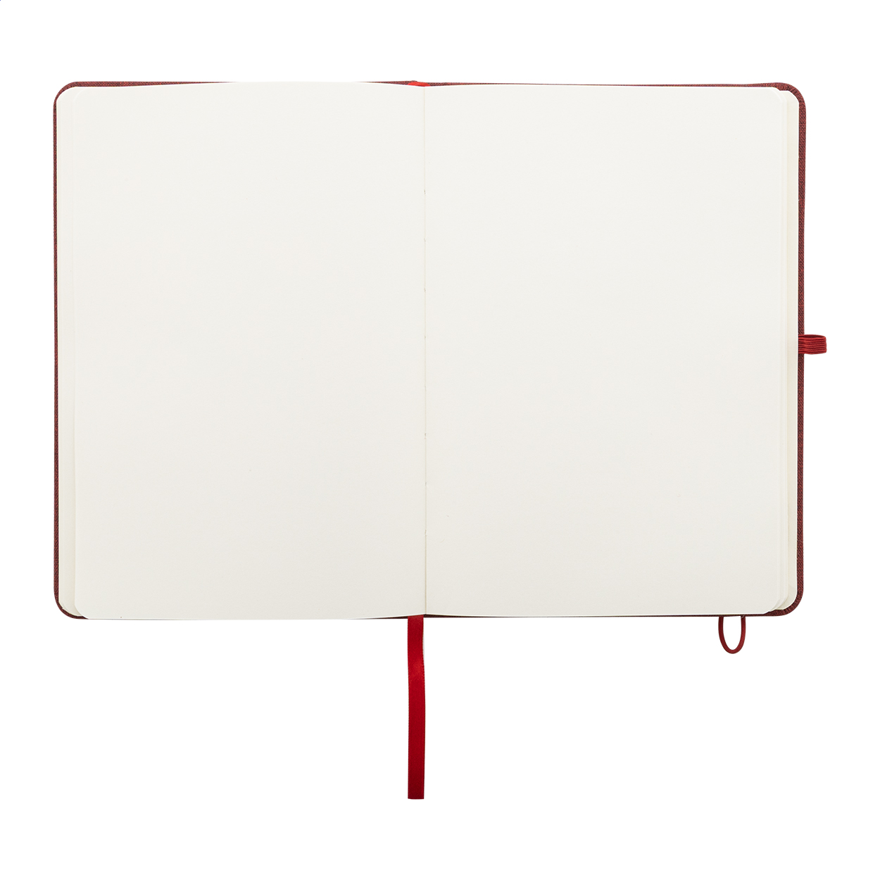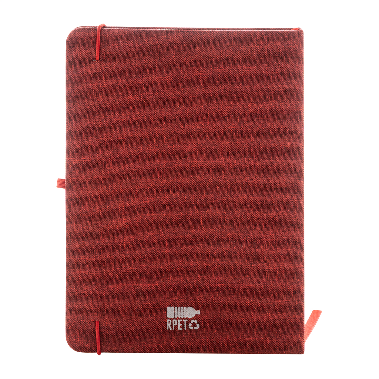 Quaderno formato A5 con 80 pagine bianche, copertina in poliestere 300D RPET, elastico colorato, segnalibro e porta penna.