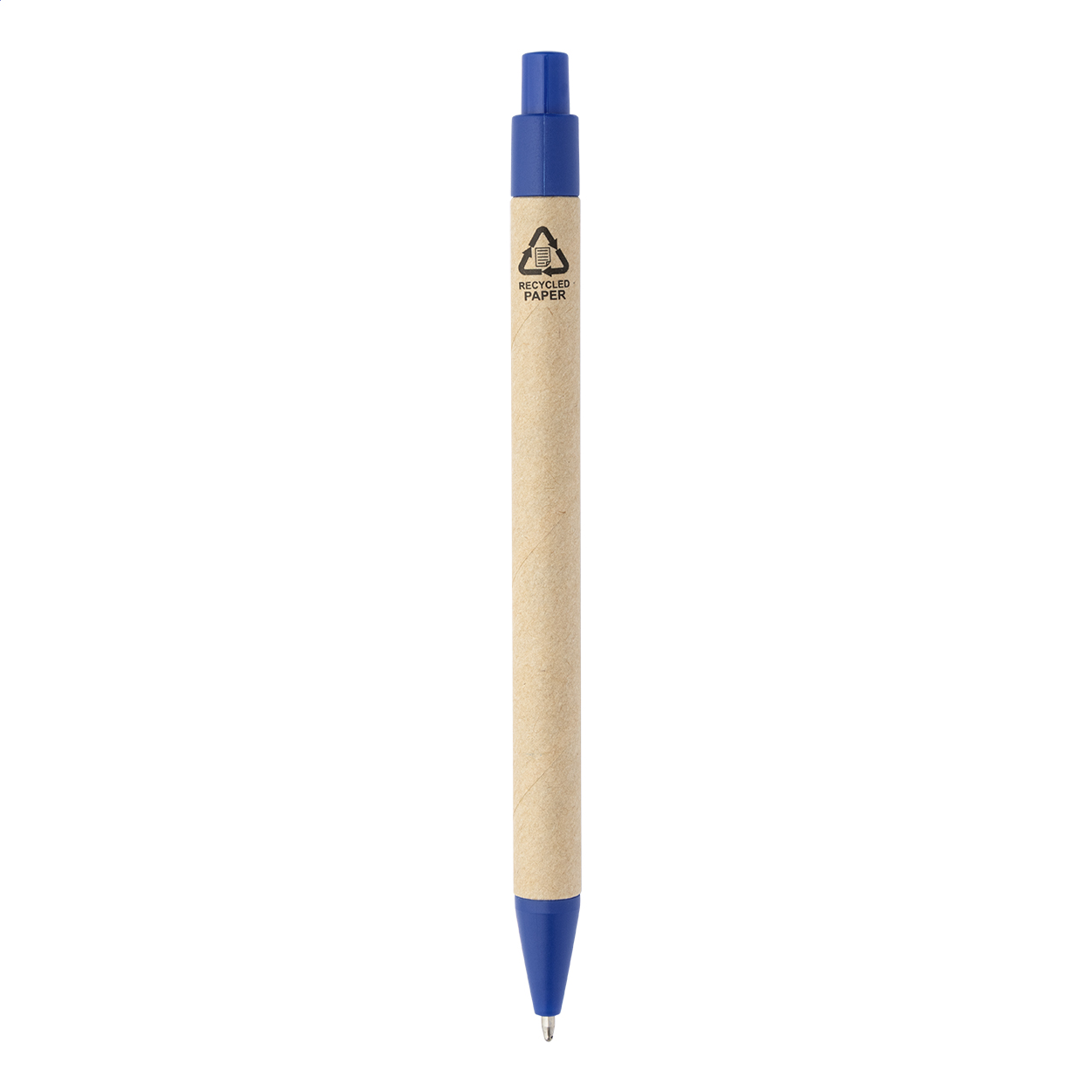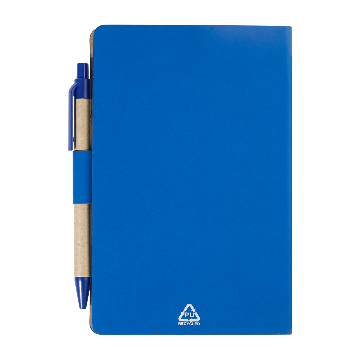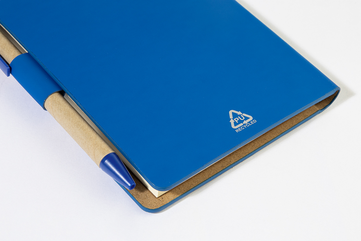 Quaderno con copertina in pelle PU riciclata, 70 fogli a righe in carta riciclata, 125 segna pagine (in 5 colori diversi) e penna a sfera in PP riciclato con refill blu.