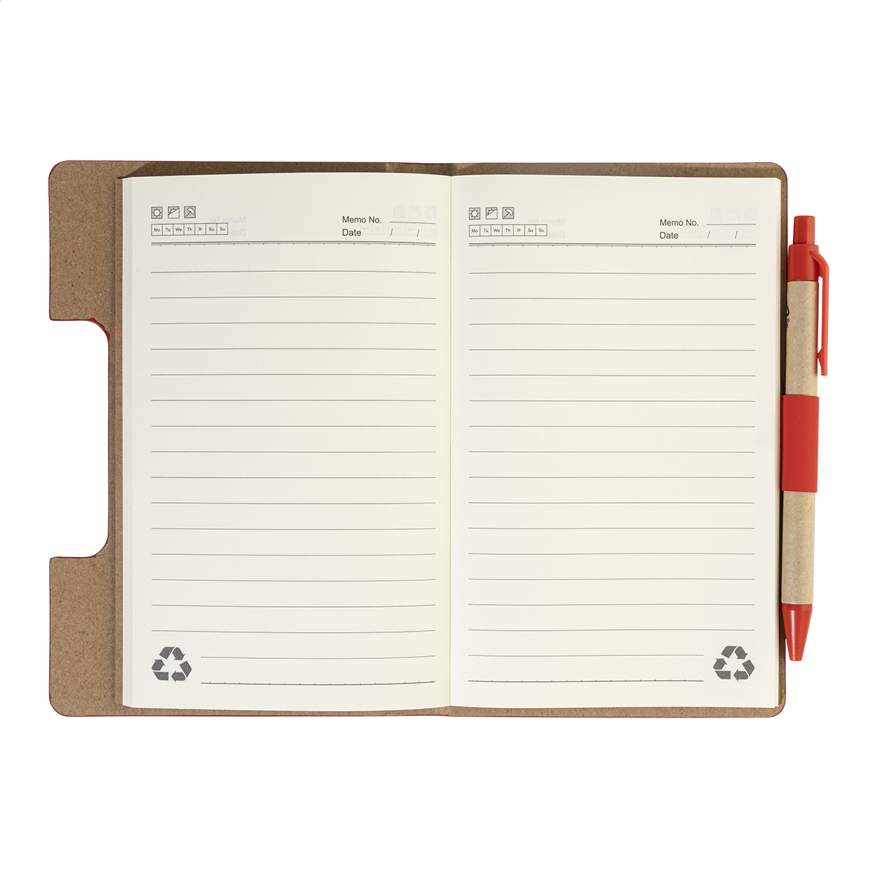 Quaderno con copertina in pelle PU riciclata, 70 fogli a righe in carta riciclata, 125 segna pagine (in 5 colori diversi) e penna a sfera in PP riciclato con refill blu.