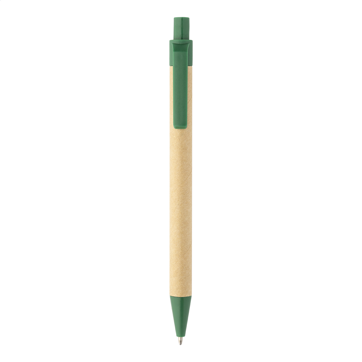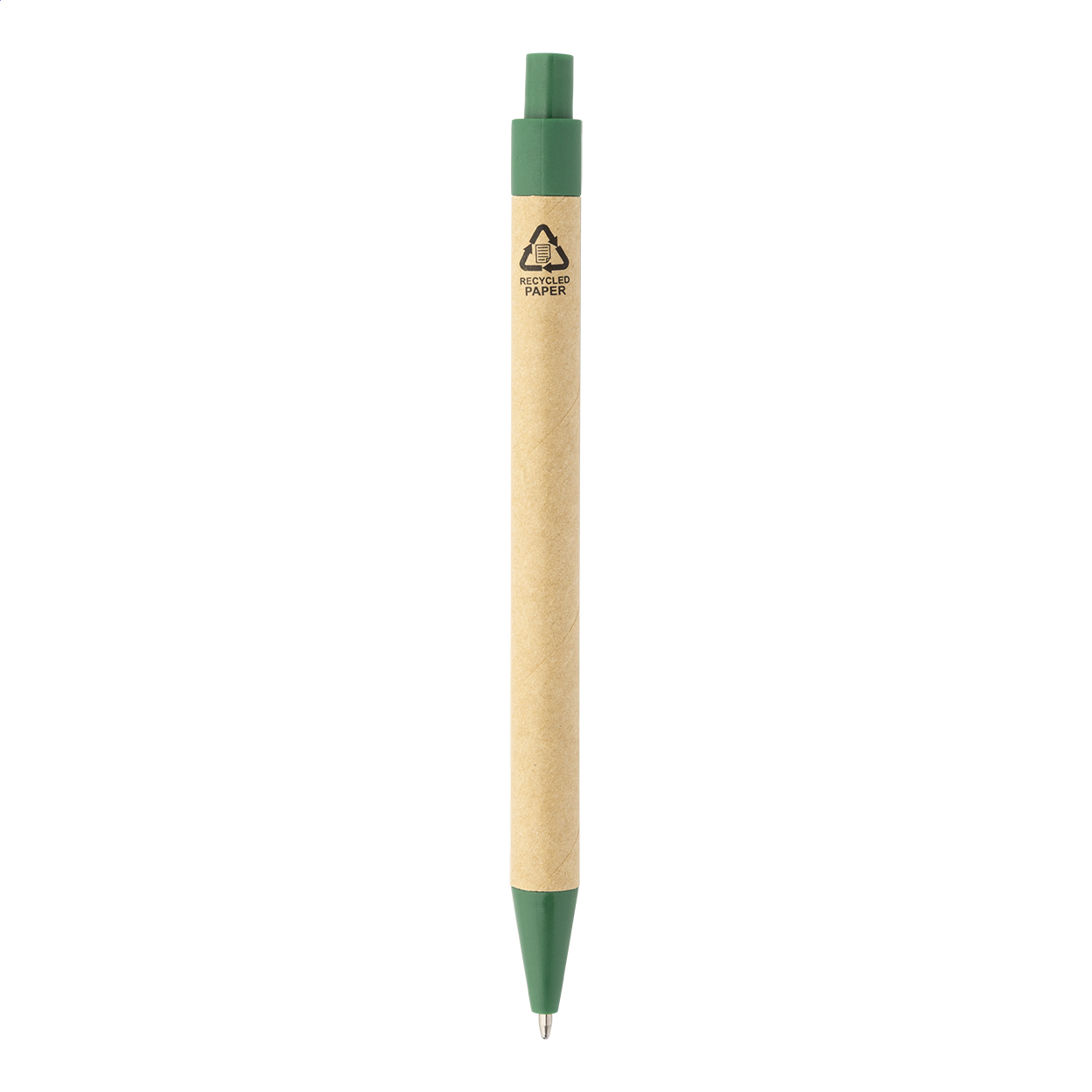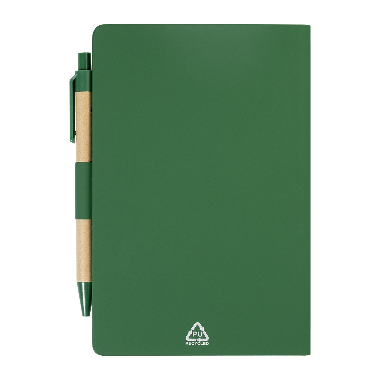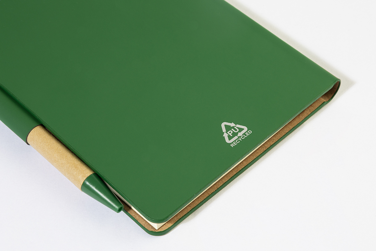 Quaderno con copertina in pelle PU riciclata, 70 fogli a righe in carta riciclata, 125 segna pagine (in 5 colori diversi) e penna a sfera in PP riciclato con refill blu.