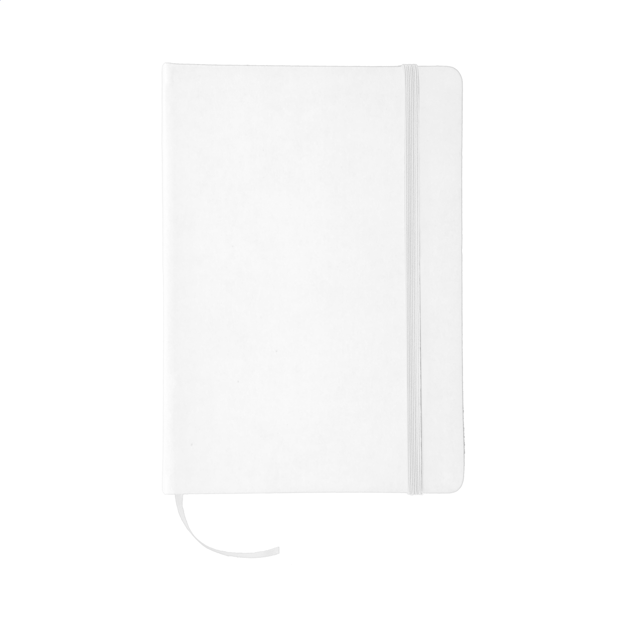 Quaderno con 100 fogli bianchi rivestito in pelle PU, segnalibro e cinturino in gomma coordinati.