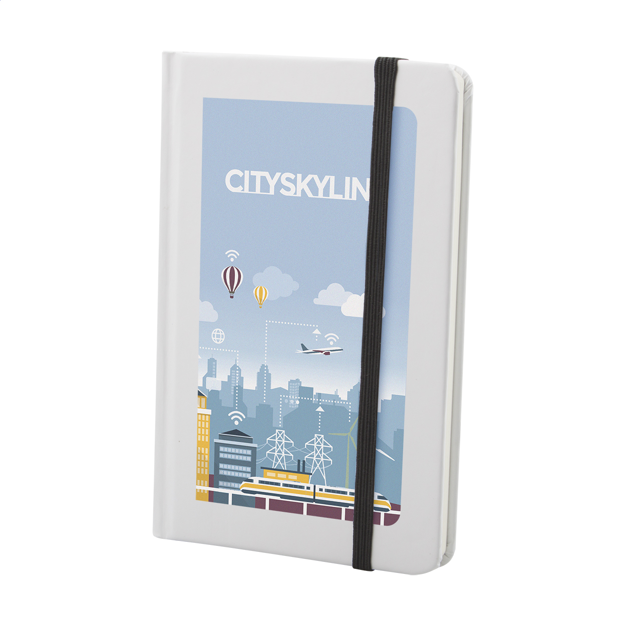 Quaderno con copertina in cartoncino da 80 fogli bianchi ed elastico chiusura colorato. Formato A6.