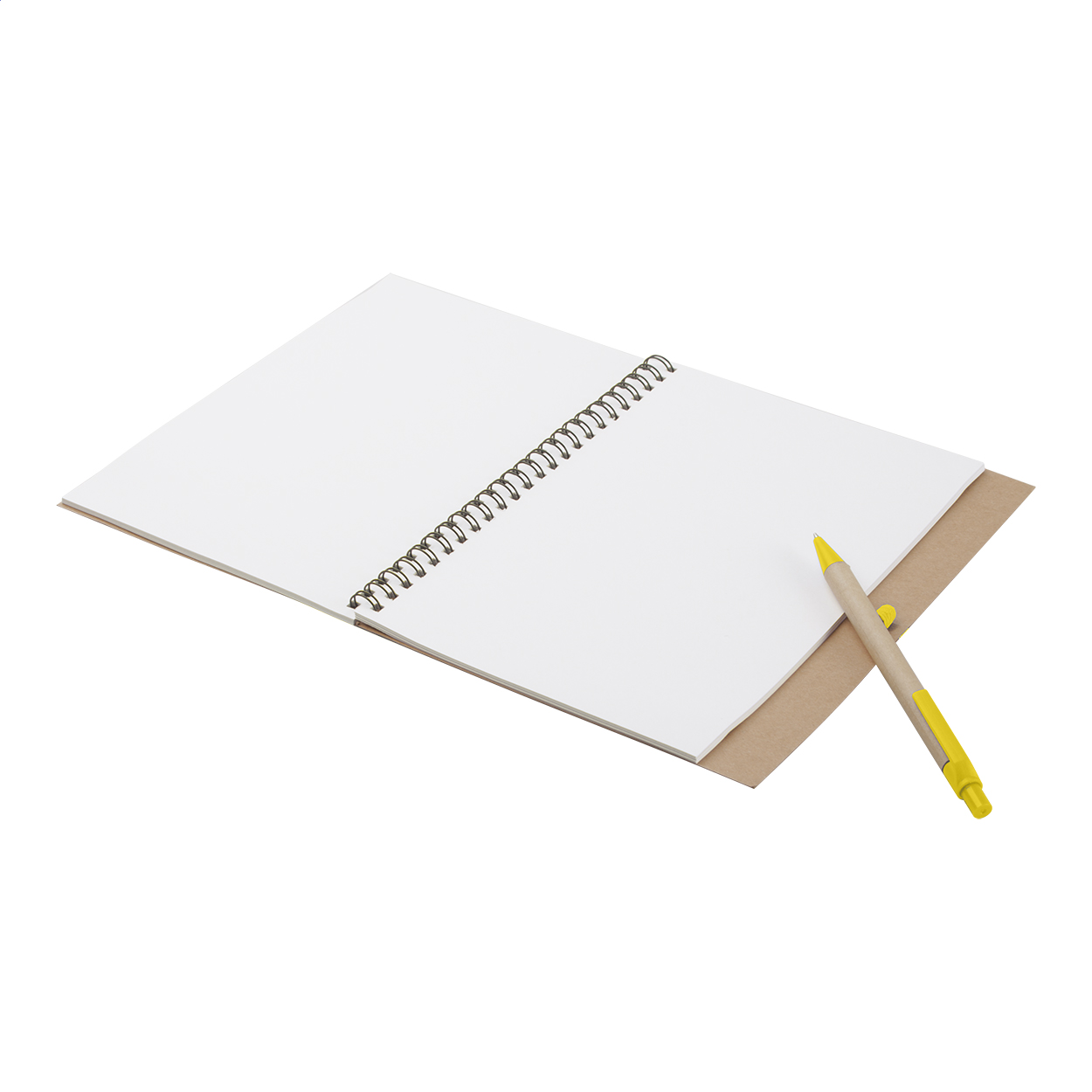 Quaderno con copertina in carta riciclata, 60 fogli bianchi e penna a sfera.
