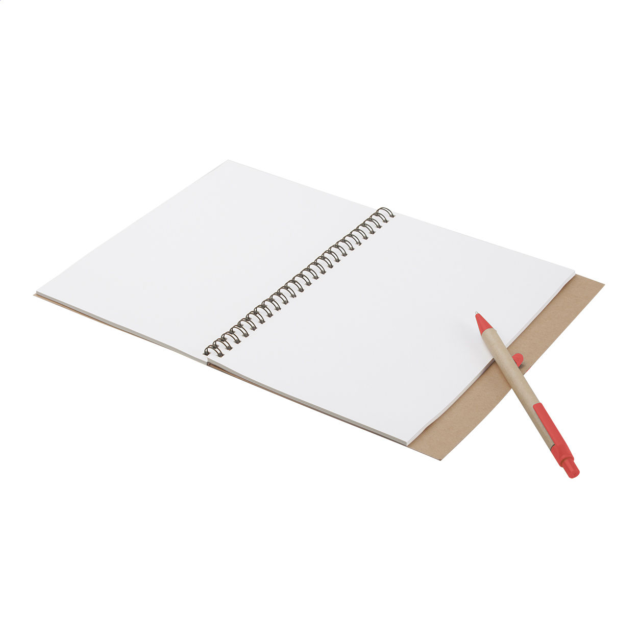 Quaderno con copertina in carta riciclata, 60 fogli bianchi e penna a sfera.