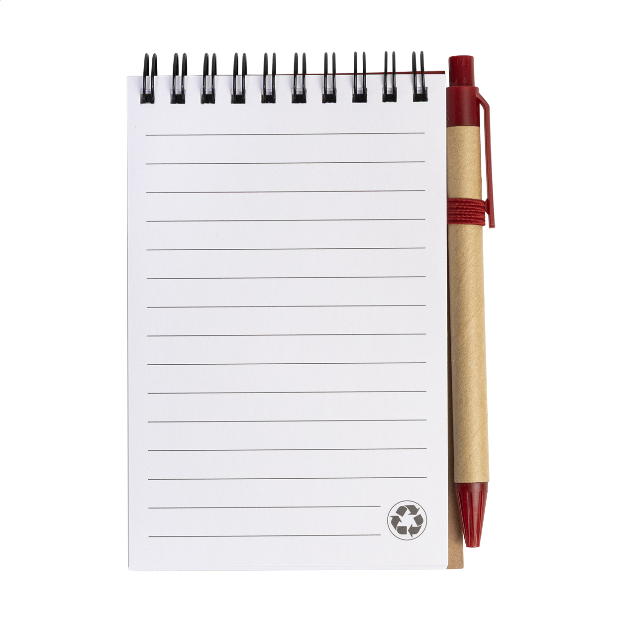 Blocco note a spirale con 70 fogli a righe, copertina in carta riciclata e penna a sfera in cartone riciclato con refill blu. Formato A6.
