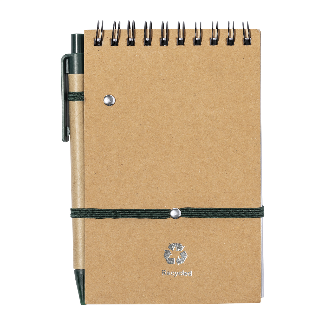 Blocco note a spirale con 70 fogli a righe, copertina in carta riciclata e penna a sfera in cartone riciclato con refill blu. Formato A6.