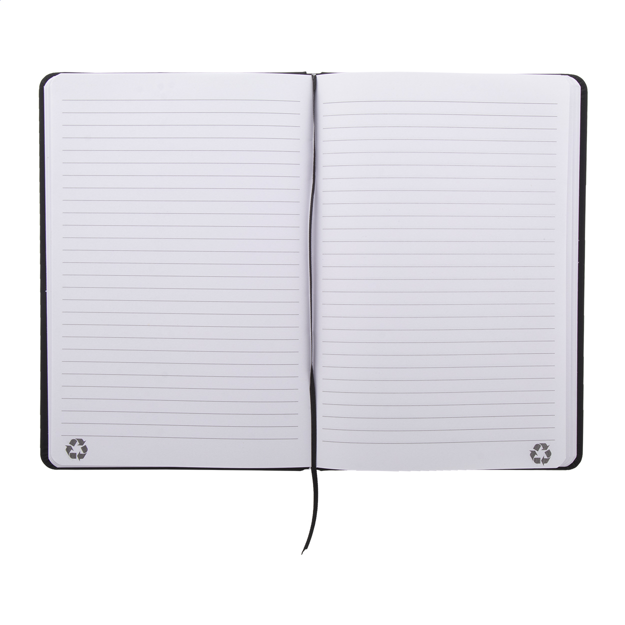 Quaderno con copertina in PU riciclato da 100 fogli in carta riciclata a righe. Segnalibro in colore coordinato ed elastico. Formato A5.