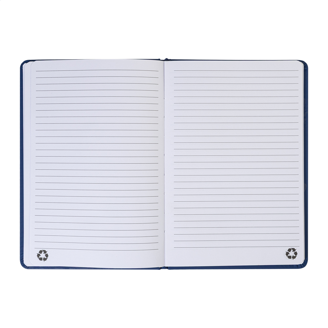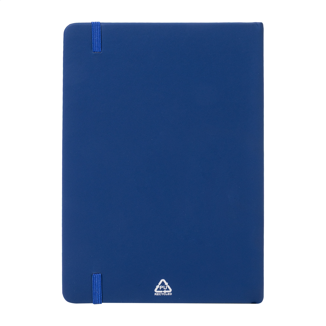 Quaderno con copertina in PU riciclato da 100 fogli in carta riciclata a righe. Segnalibro in colore coordinato ed elastico. Formato A5.