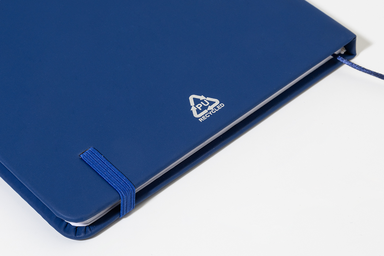 Quaderno formato A5, con copertina in PU riciclata con 100 fogli in carta riciclata, elastico e segnalibro in colore coordinato