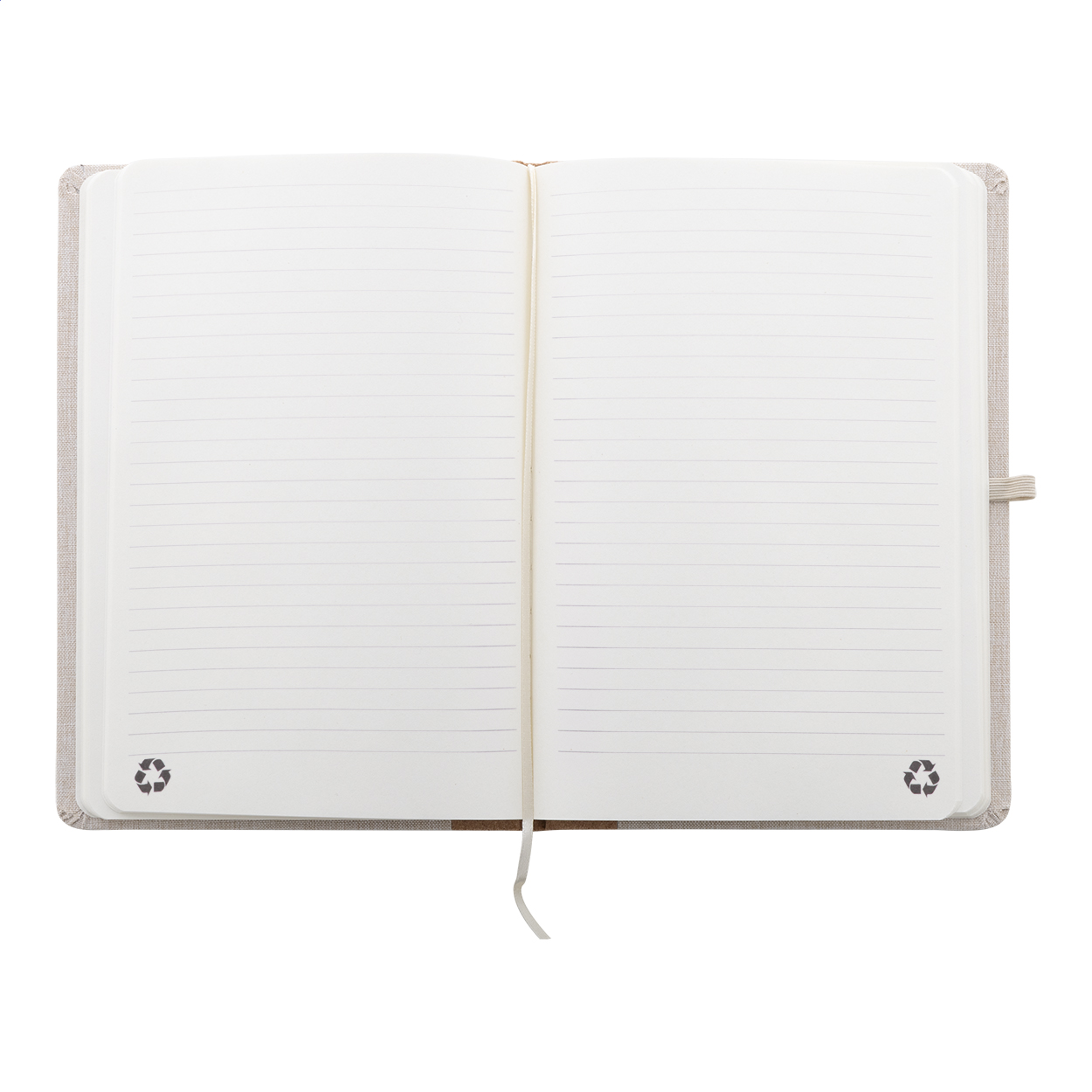 Quaderno formato A5 con copertina in poliestere RPET, dorso in sughero naturale, 80 fogli a righe in carta riciclata, segnalibro, elastico in gomma e portapenne.