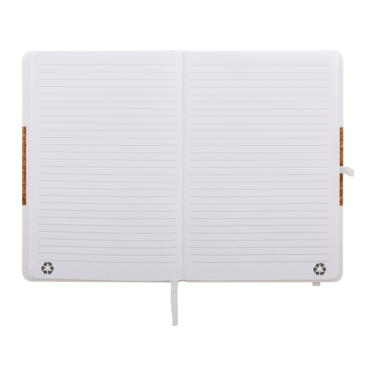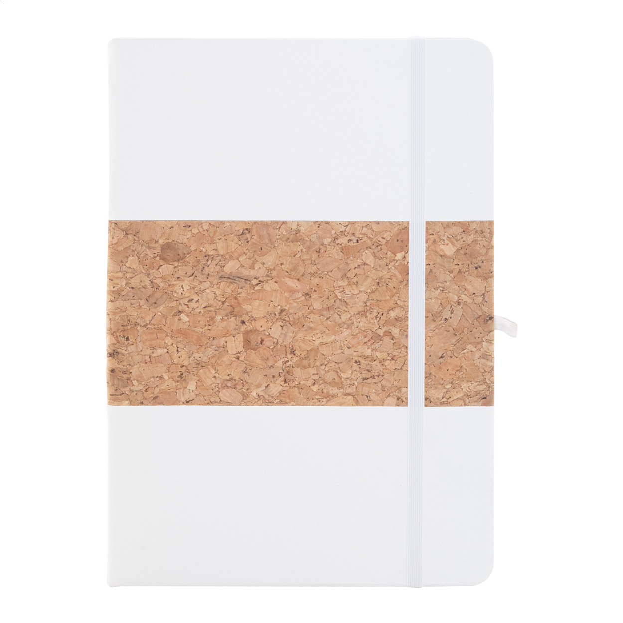 Quaderno formato A5 con copertina in sughero naturale e pelle PU riciclata, 80 fogli a righe in carta riciclata, segnalibro in colore coordinato, elastico e portapenne.