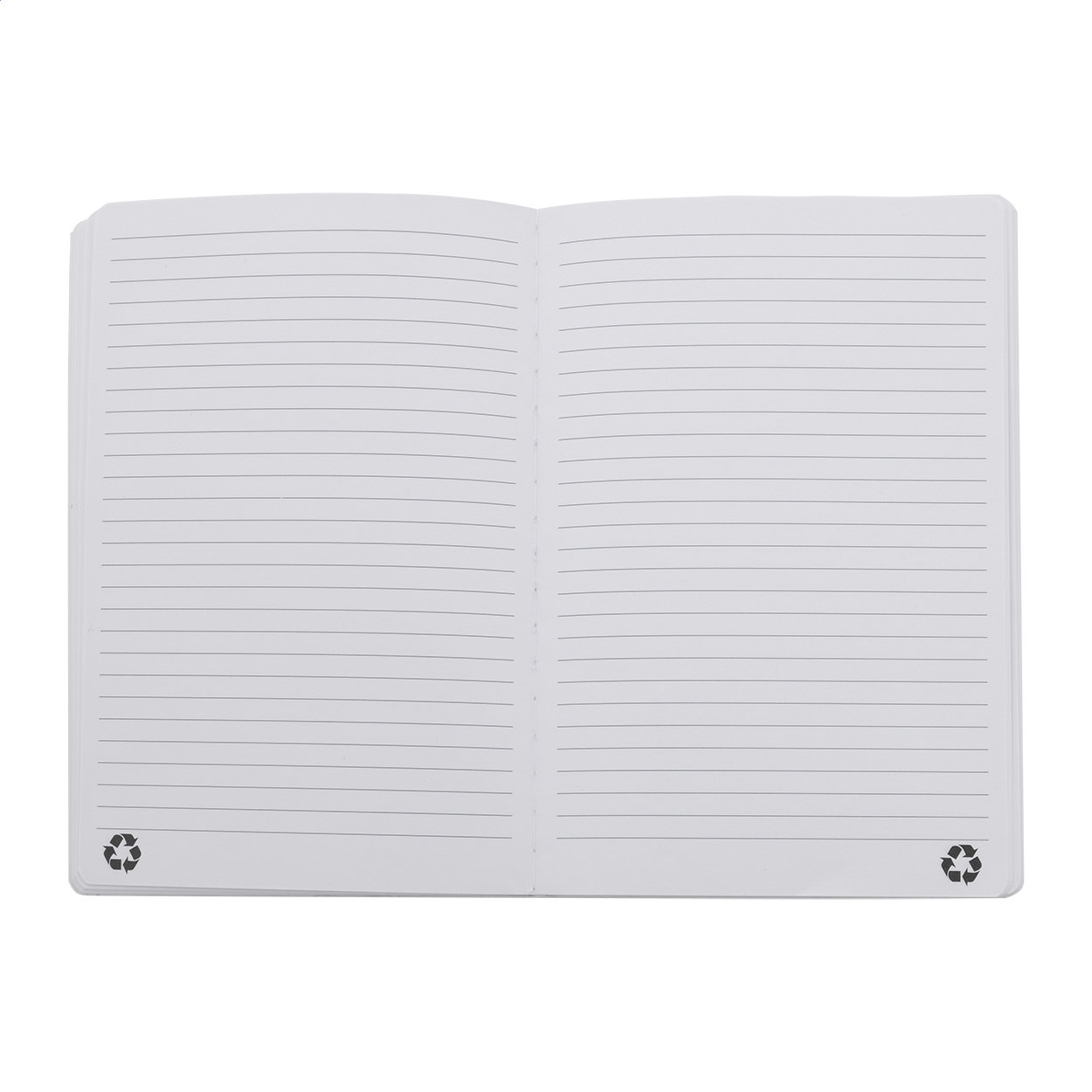 Quaderno nel formato A5 in pelle PU riciclata, copertina morbida con 80 fogli in carta riciclata a righe, segnalibro ed elastico in colore coordinato.