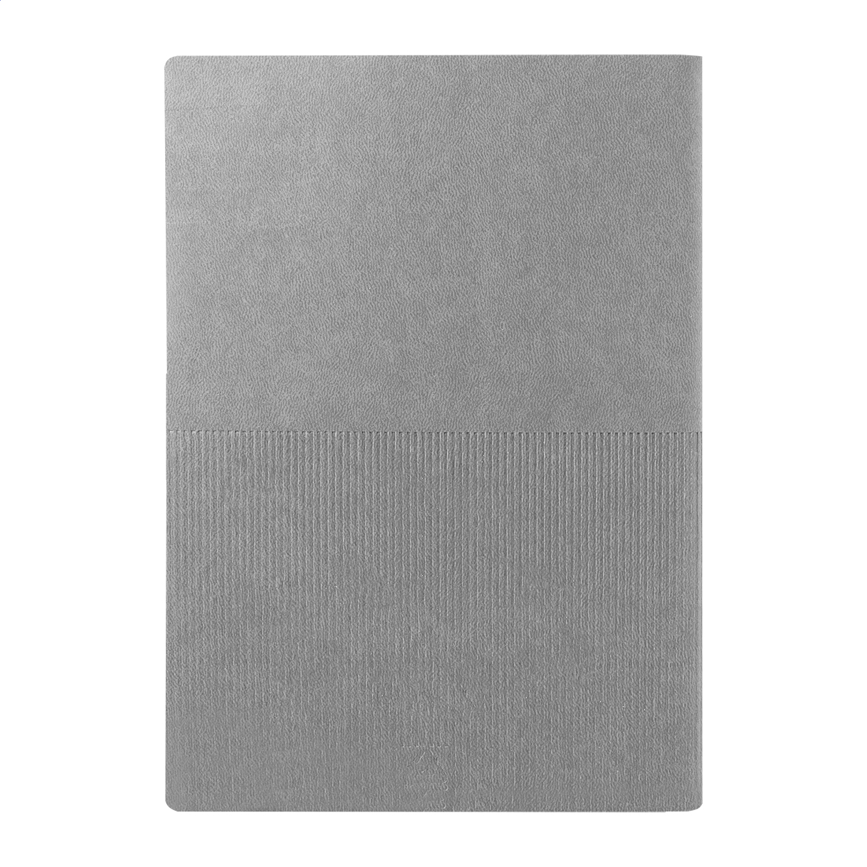 Quaderno formato A5, con copertina in pelle PU riciclata, decorazione a strisce, placca metallica, segnalibro e 80 fogli a righe in carta riciclata.