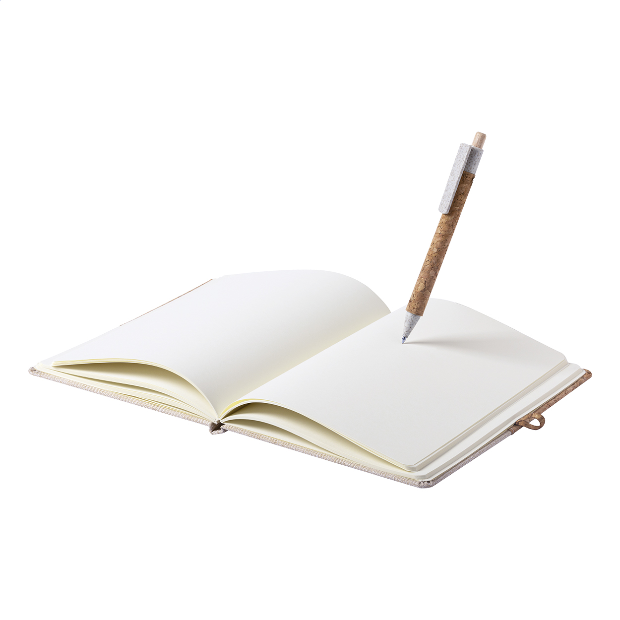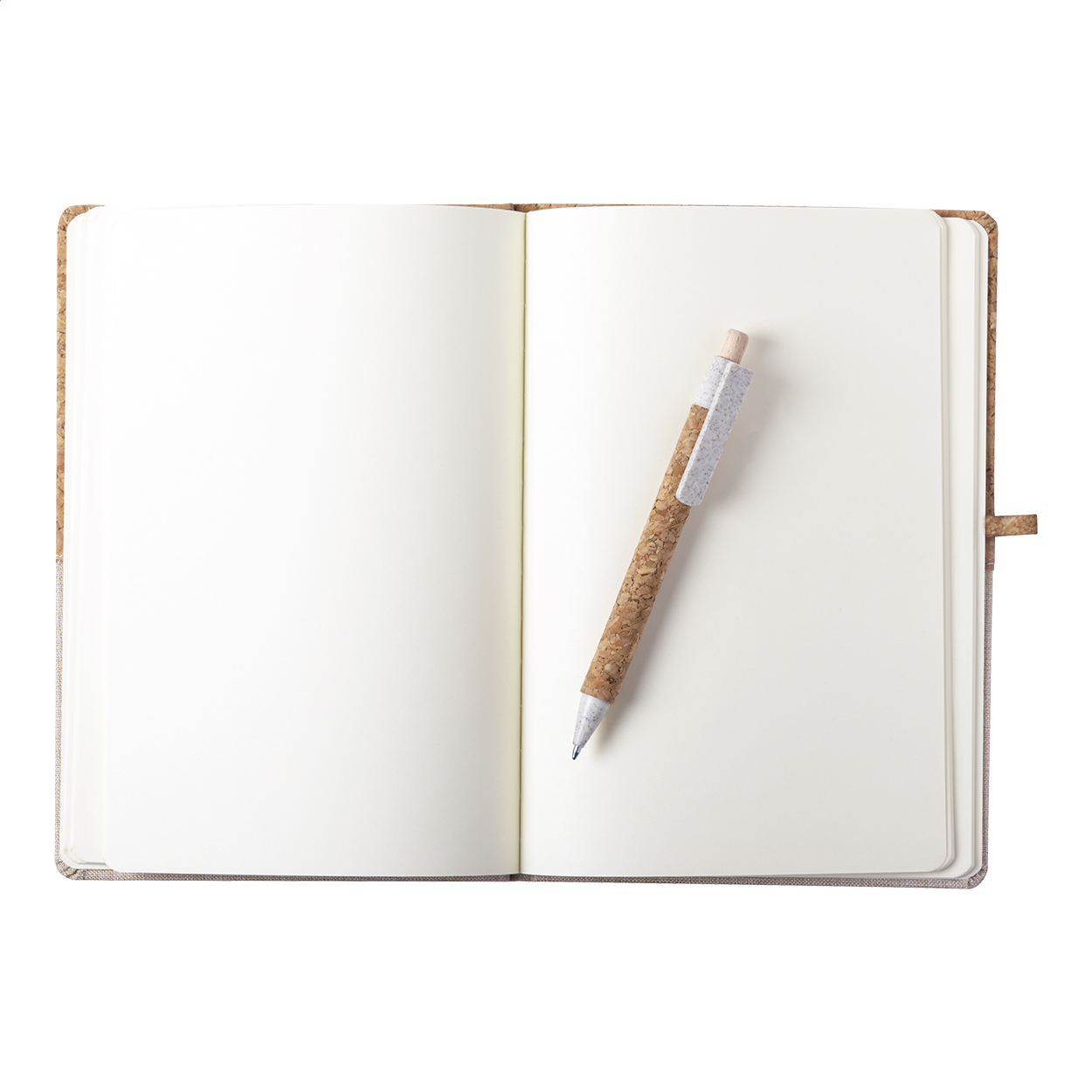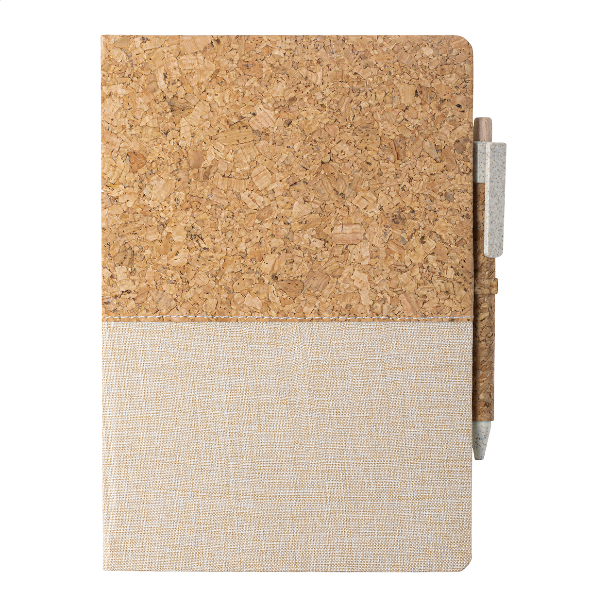 Quaderno formato A5 con copertina in sughero naturale e cotone con 80 fogli bianchi, penna a sfera con parti in plastica di paglia di grano e sughero e refill nero.