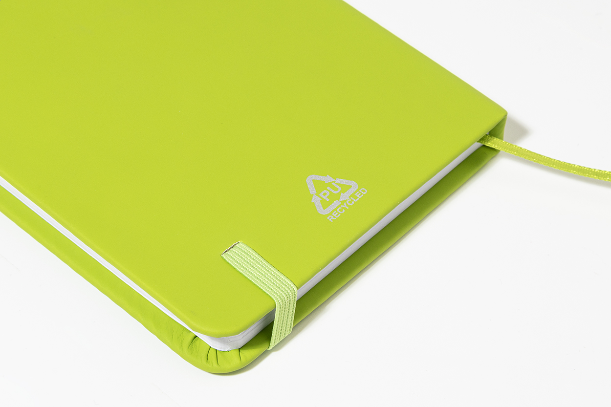 Quaderno formato A6, con copertina in PU riciclata con 100 fogli in carta riciclata, elastico e segnalibro in colore coordinato