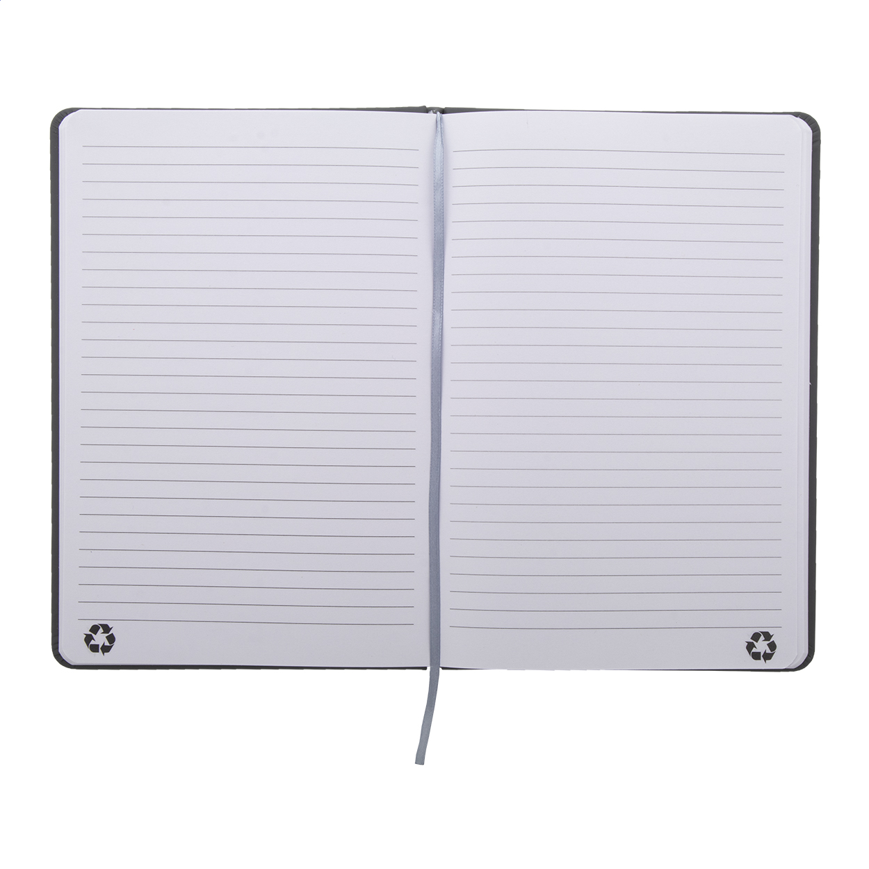 Quaderno con copertina in PU riciclato da 100 fogli in carta riciclata a righe. Segnalibro in colore coordinato ed elastico. Formato A5.