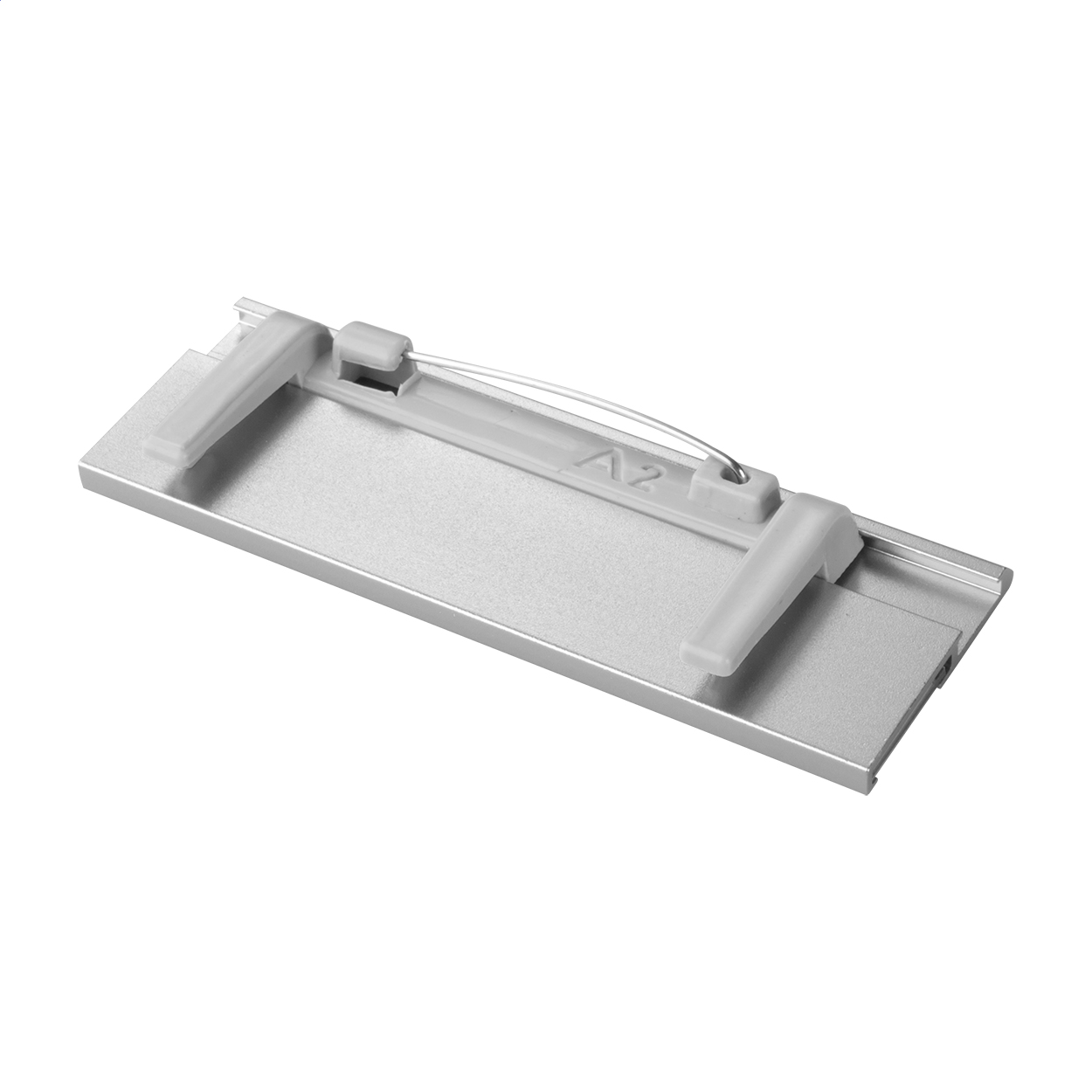 Spilla in alluminio per cartellino portanome con parti sostituibili in carta e plastica.