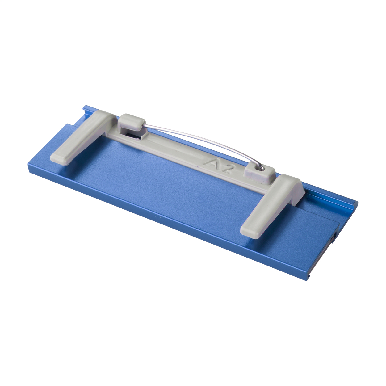 Spilla in alluminio per cartellino portanome con parti sostituibili in carta e plastica.