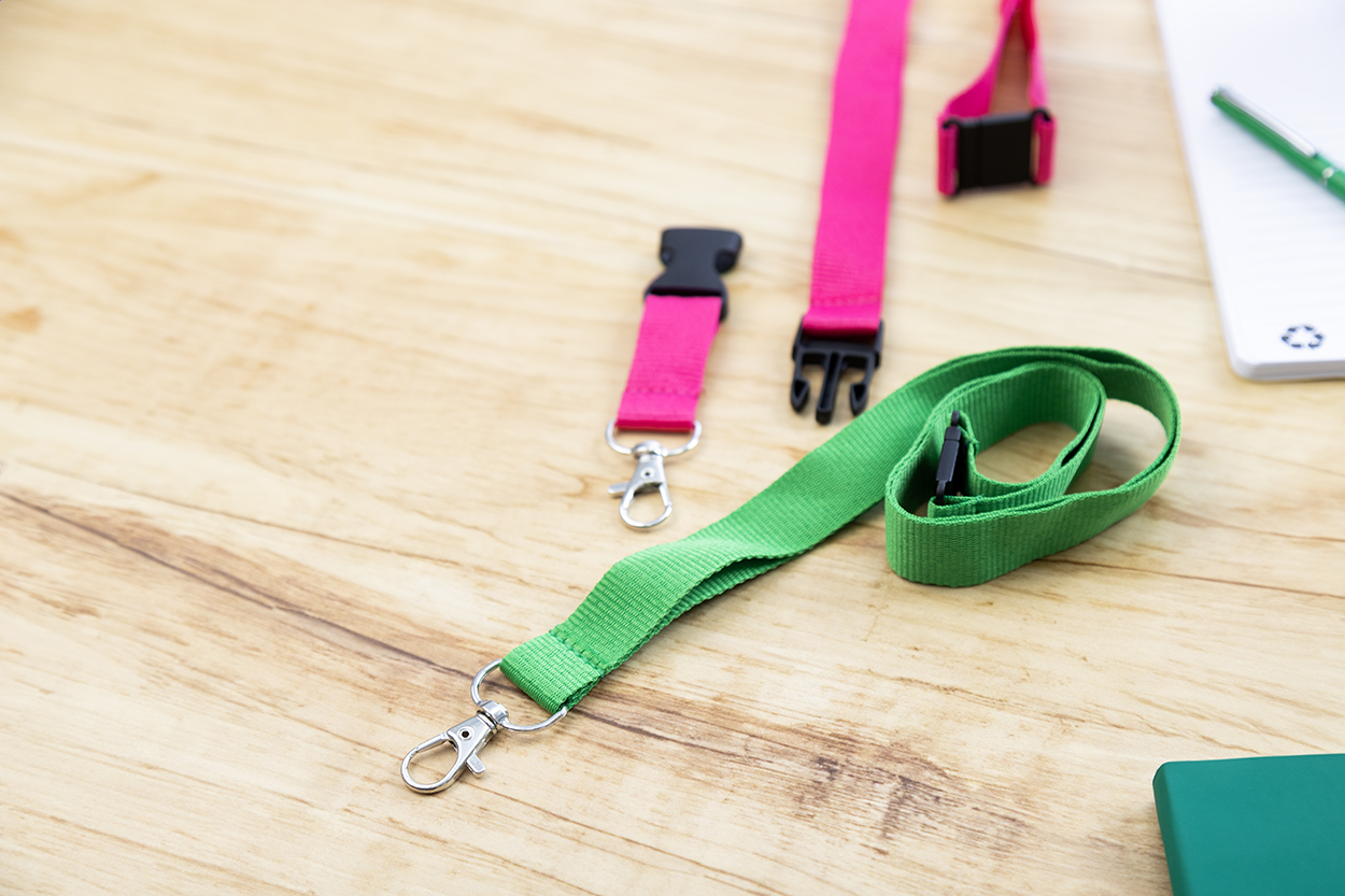 Lanyard in poliestere RPET con moschettone in metallo e fibbia di sicurezza.