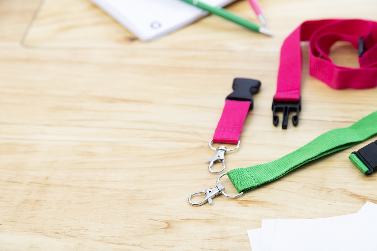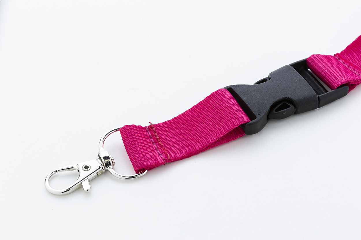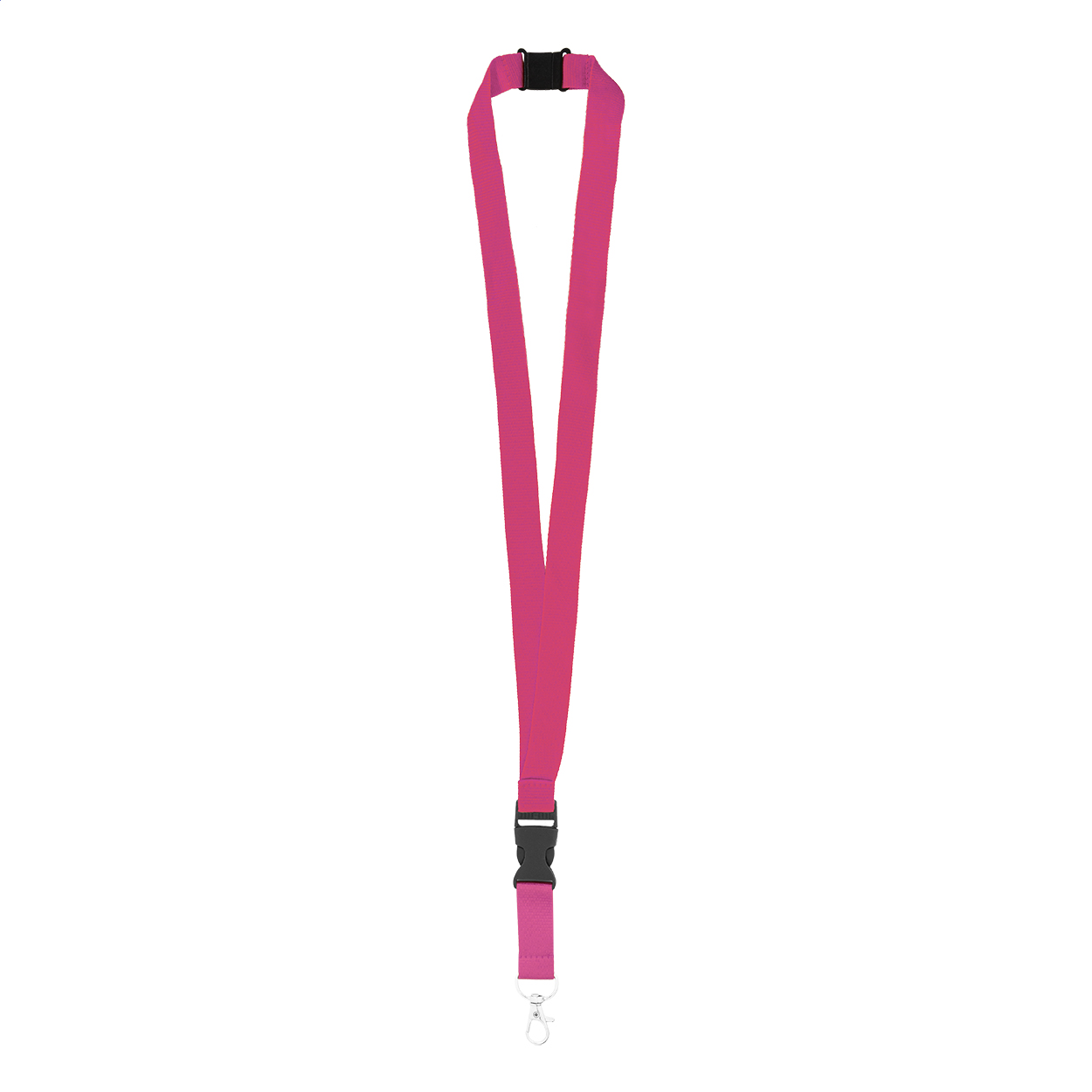 Lanyard in poliestere RPET con moschettone metallico staccabile e fibbia di sicurezza.