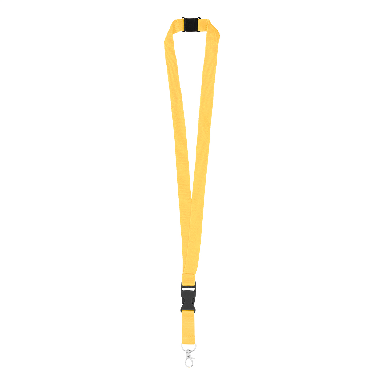 Lanyard in poliestere RPET con moschettone metallico staccabile e fibbia di sicurezza.