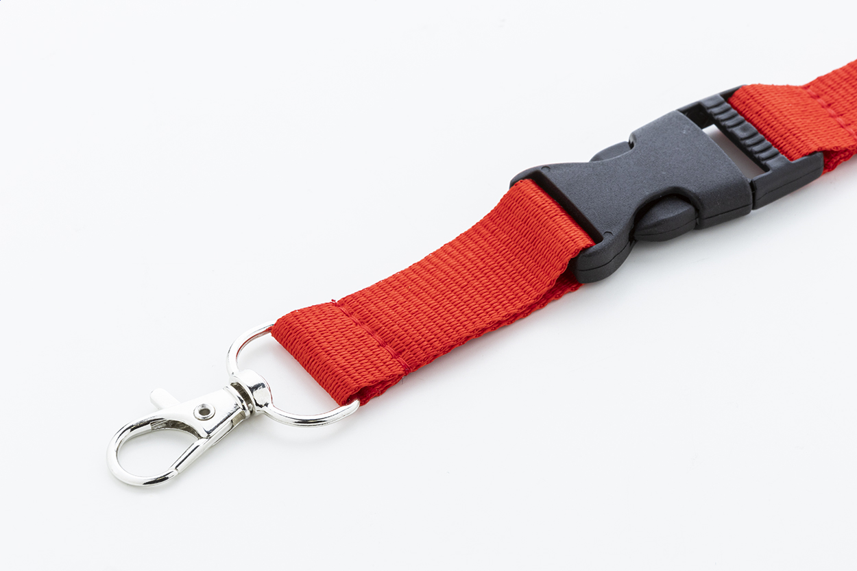 Lanyard in poliestere RPET con moschettone metallico staccabile e fibbia di sicurezza.