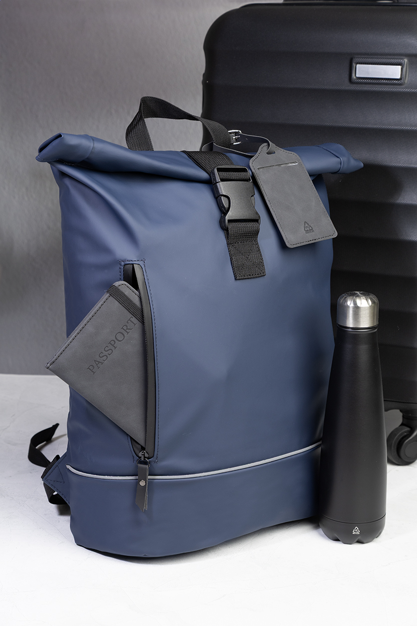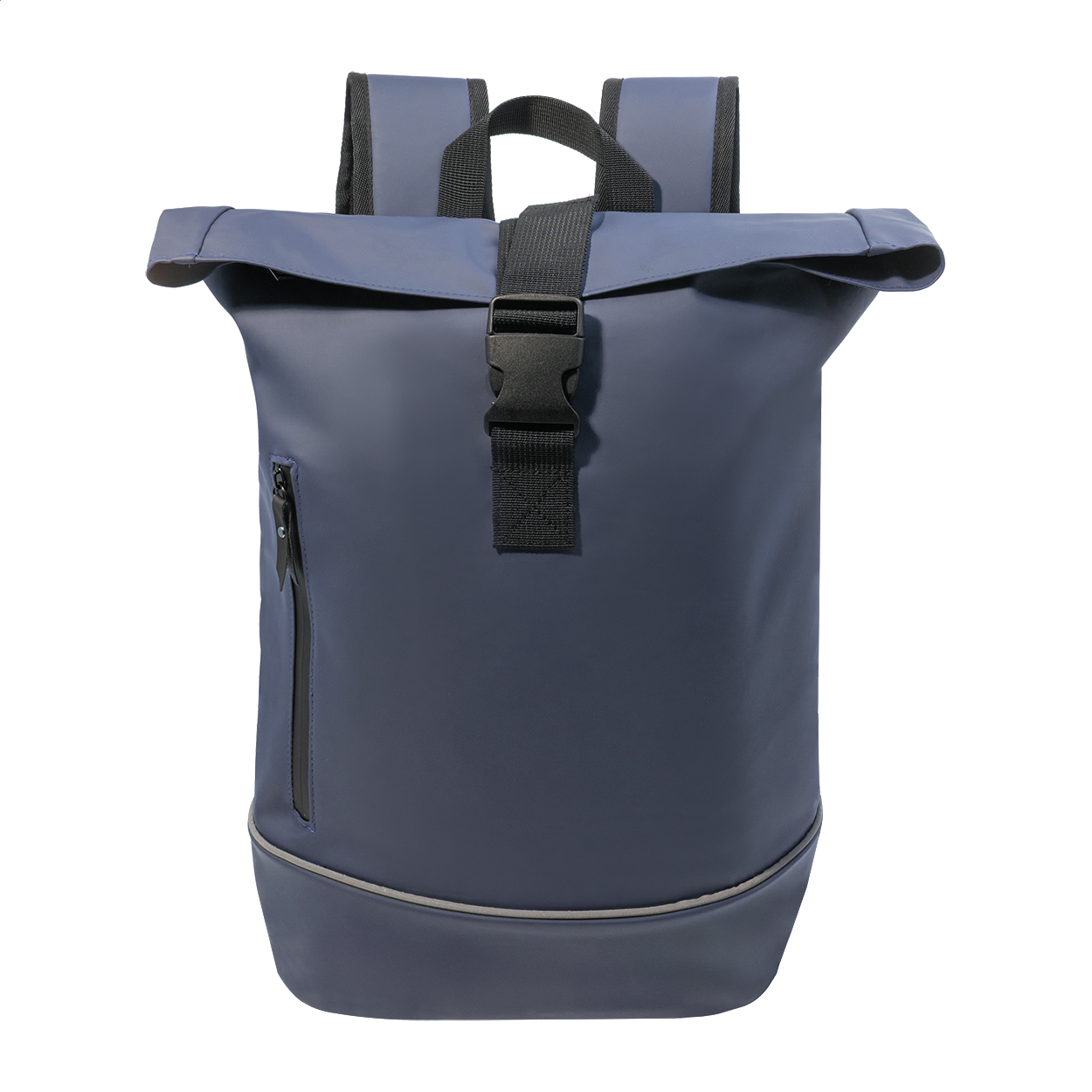 Zaino rolltop impermeabile in morbida pelle PU riciclata con chiusura a fibbia, scomparto principale chiuso da zip, tasca frontale con cerniera impermeabile, scomparto imbottito per laptop (15"), schienale e spallacci imbottiti, striscia riflettente ed etichetta PU riciclato.