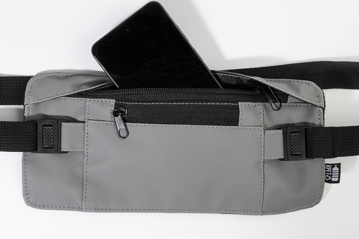 Marsupio sottile in poliestere 600D RPET con parte frontale rivestita in PU, scomparto con cerniera, tasca frontale, cinturino regolabile ed etichetta RPET.