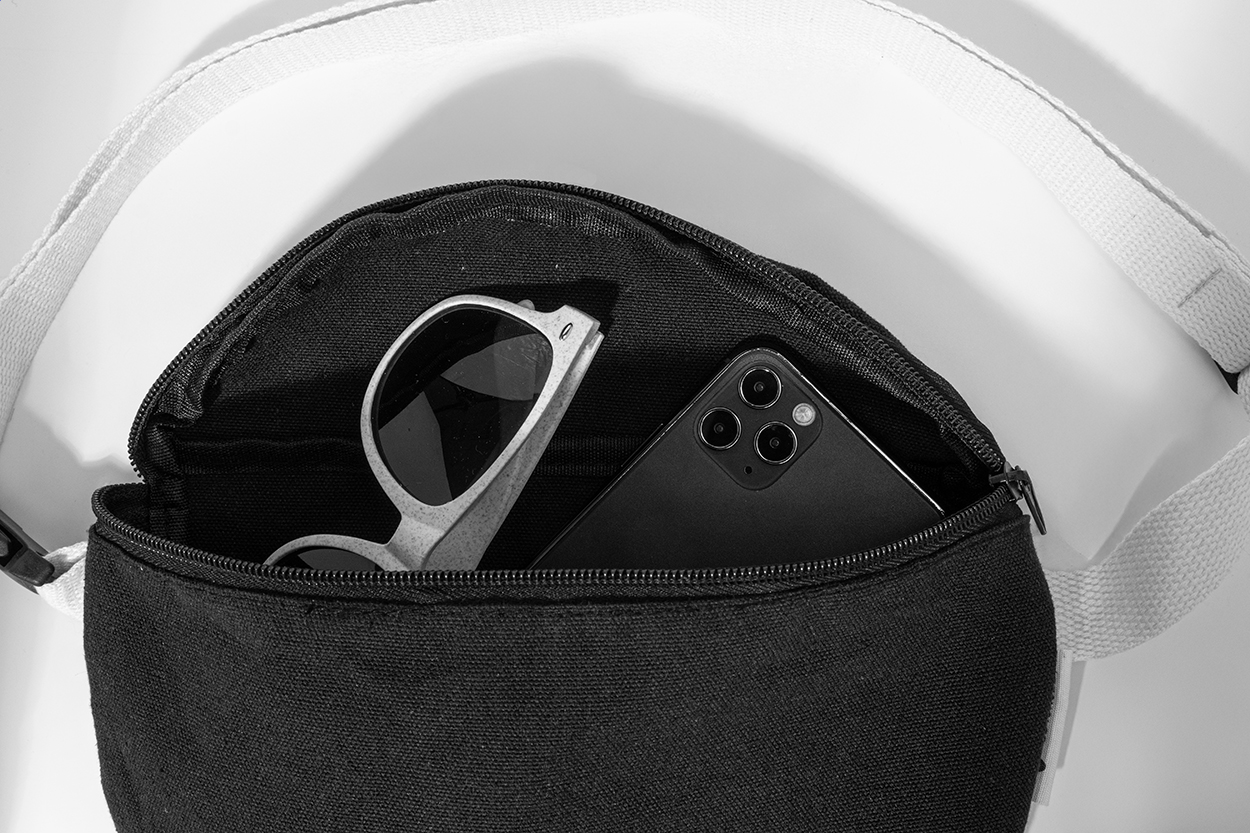 Marsupio in tela composta da 70% cotone riciclato e 30% poliestere riciclato, scomparto chiuso da cerniera, tracolla regolabile ed etichetta cotone riciclato.
