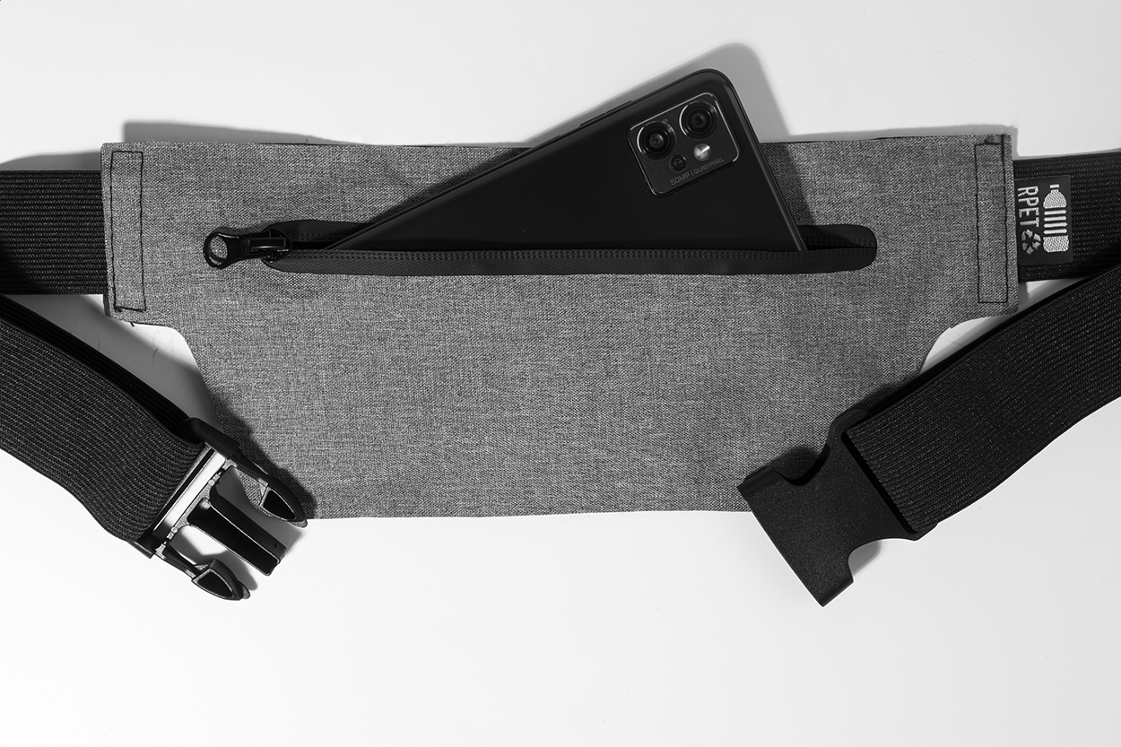 Sottile marsupio in poliestere 300D RPET con tasca chiusa da cerniera, cinturino elastico regolabile ed etichetta RPET.