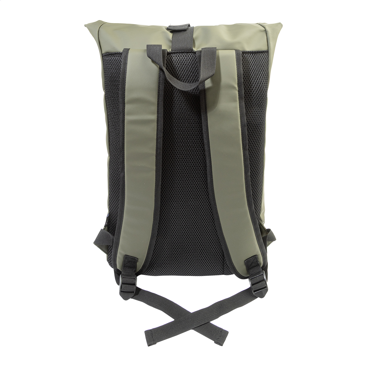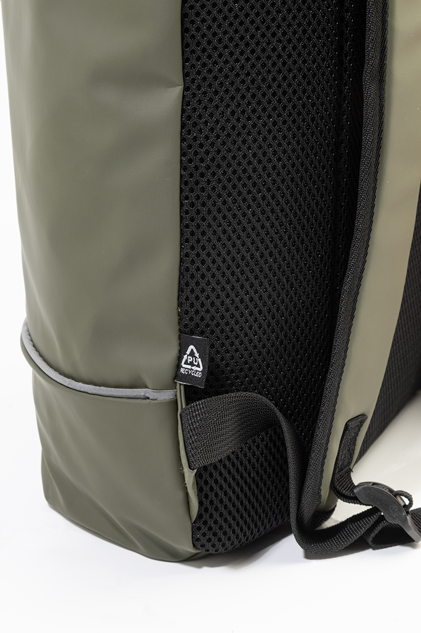 Zaino rolltop impermeabile in morbida pelle PU riciclata con chiusura a fibbia, scomparto principale chiuso da zip, tasca frontale con cerniera impermeabile, scomparto imbottito per laptop (15"), schienale e spallacci imbottiti, striscia riflettente ed etichetta PU riciclato.