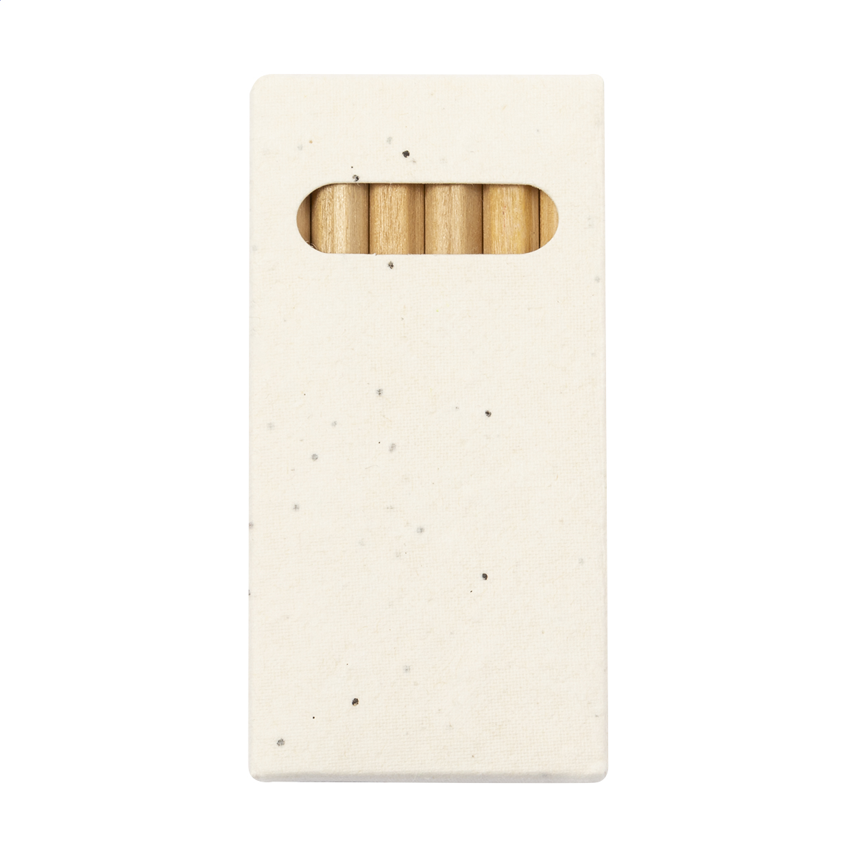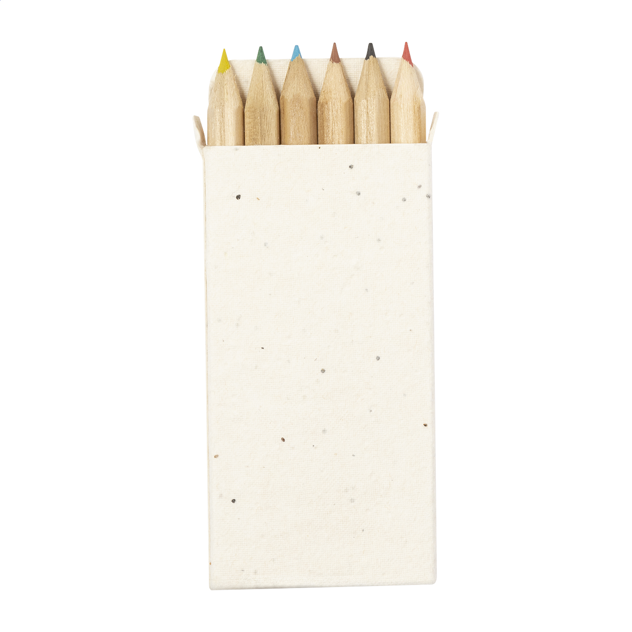 Set di 6 matite colorate in legno in una confezione realizzata con carta di semi. La scatola in carta di semi contiene semi di petunia in colori assortiti, che possono essere piantati successivamente all'uso.