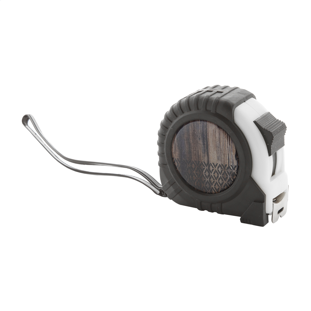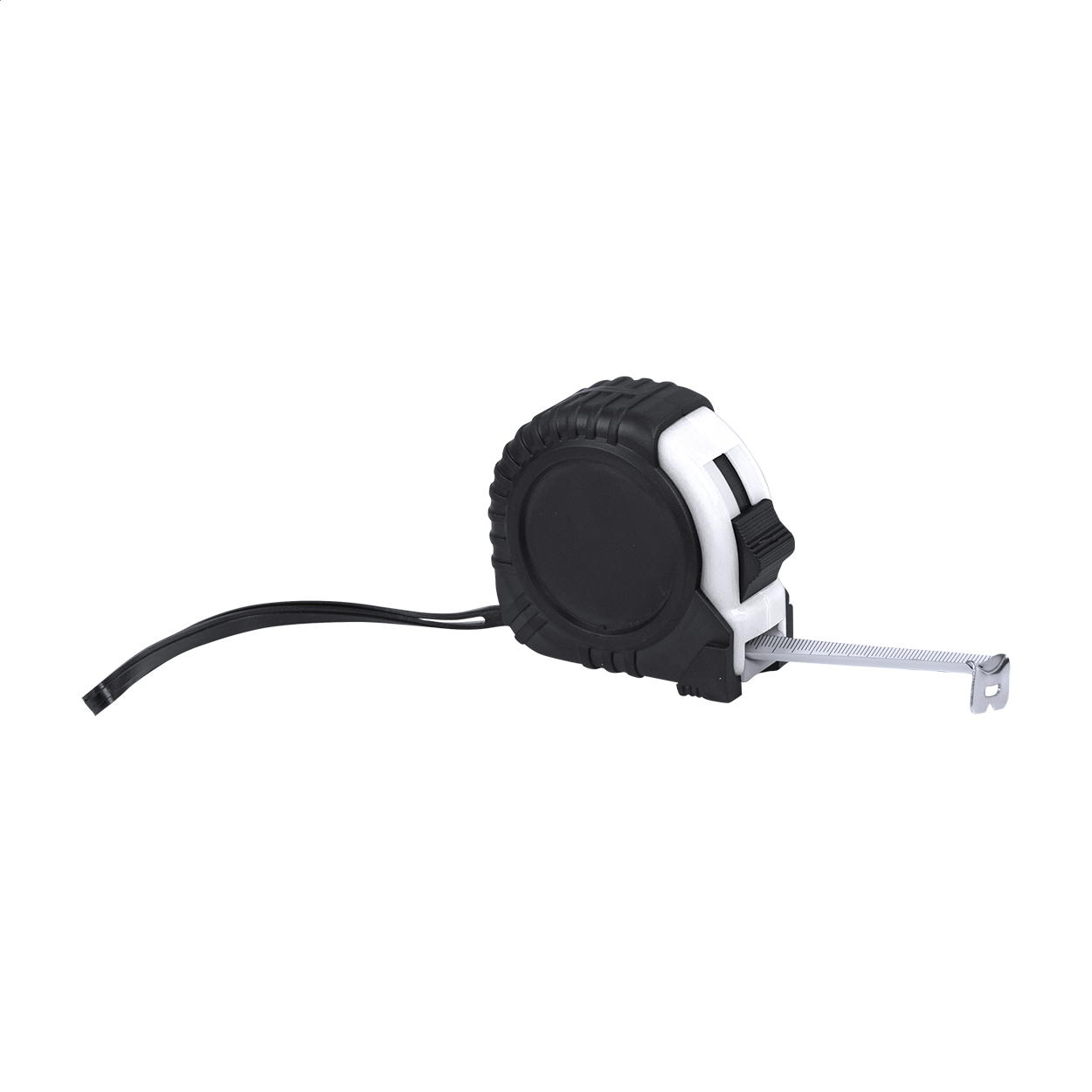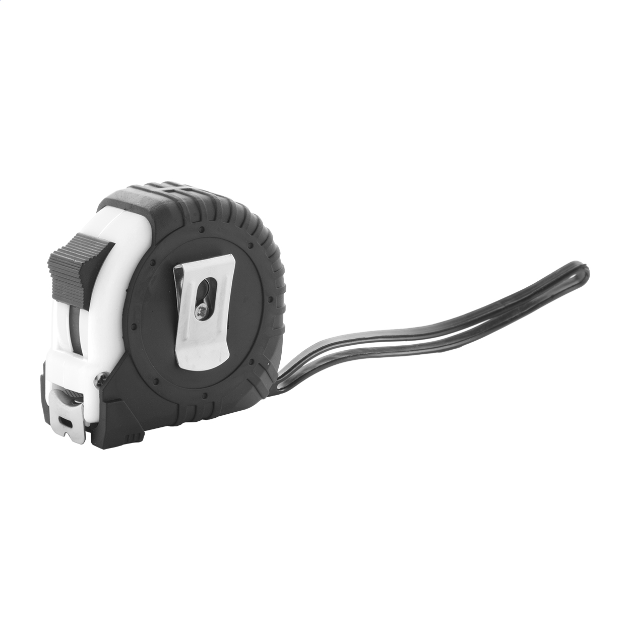 Flessometro in plastica, con funzione di blocco e clip in metallo per cintura. Lunghezza 5mt.