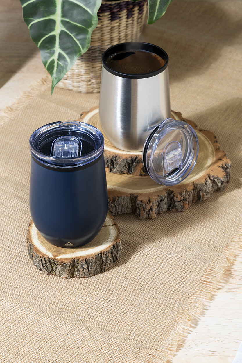 Bicchiere termico in acciaio riciclato a doppia parete da 350ml con interno in PP e coperchio erogatore in PS.